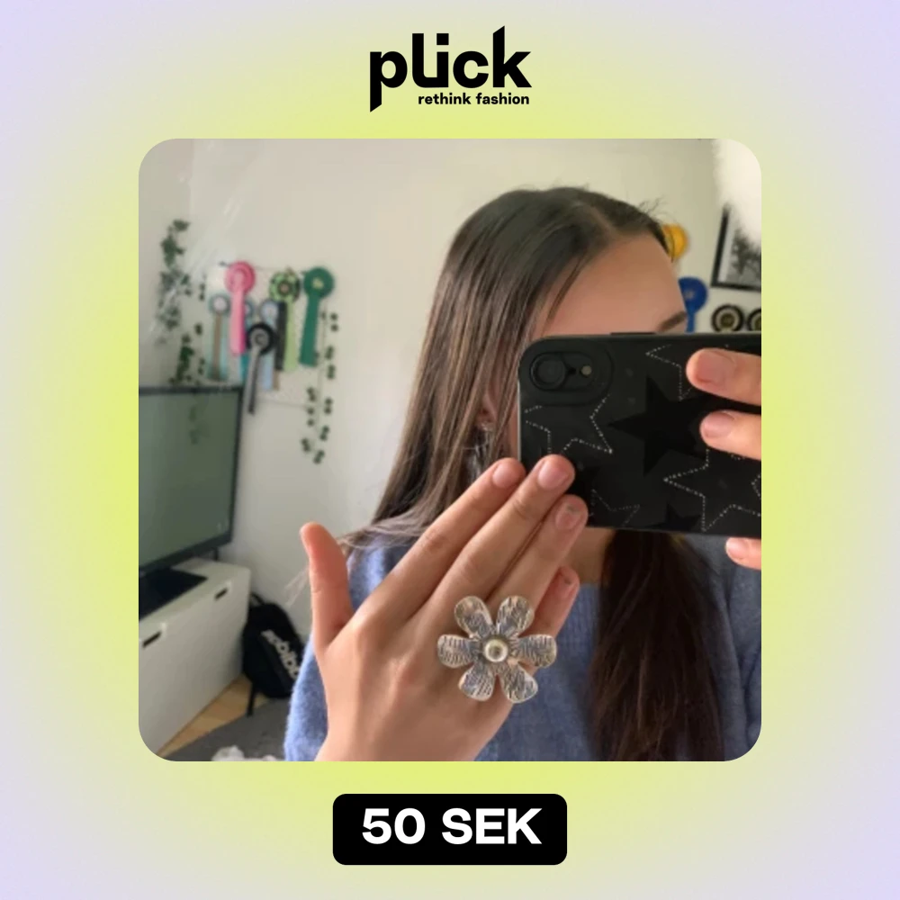 Justerbar ring i form av en blomma. Blomman är cirka 4 cm stor, silver, rostfritt
