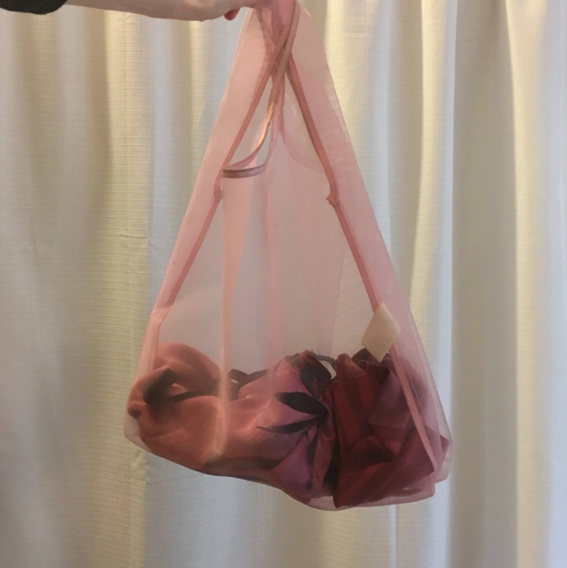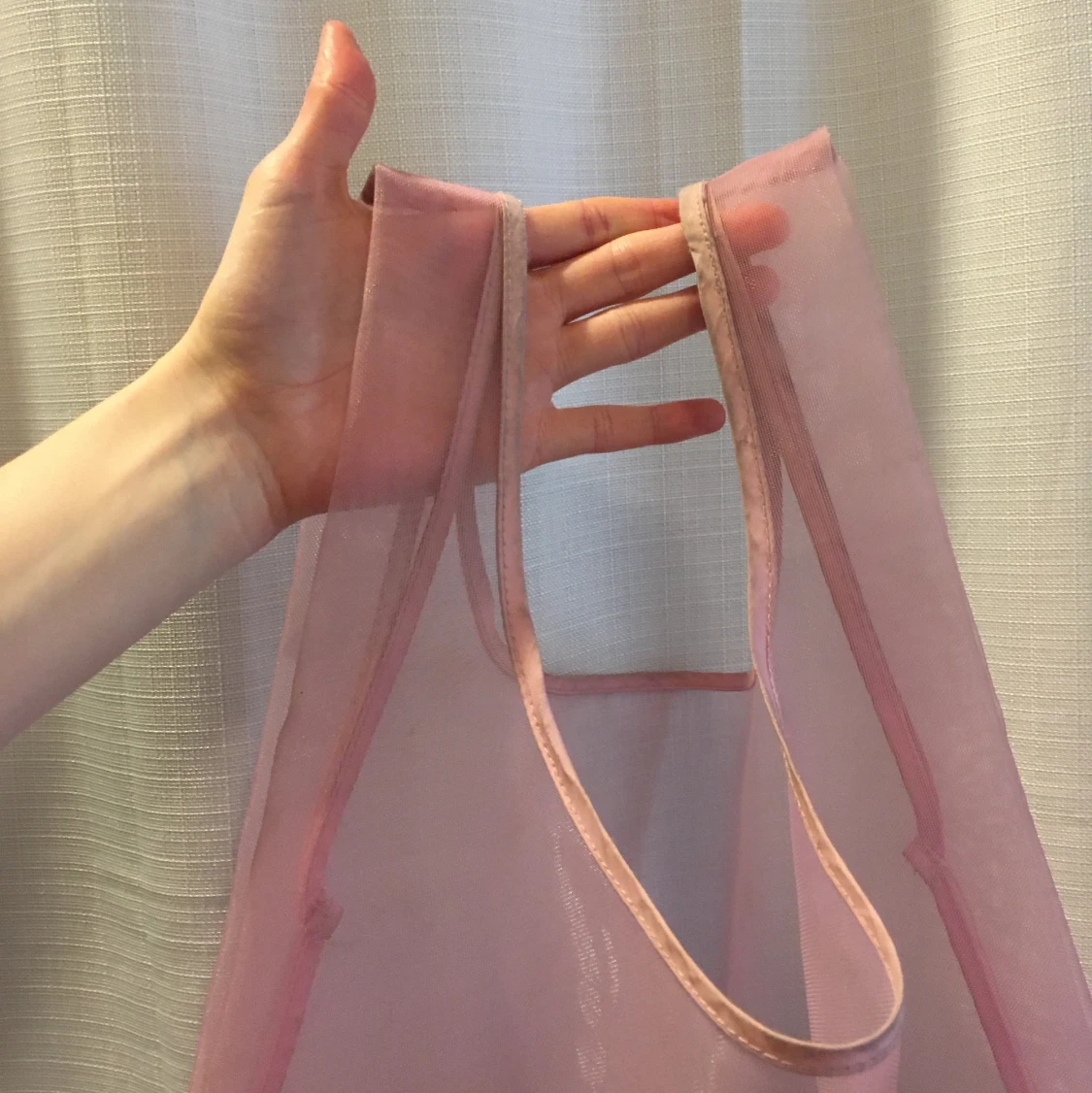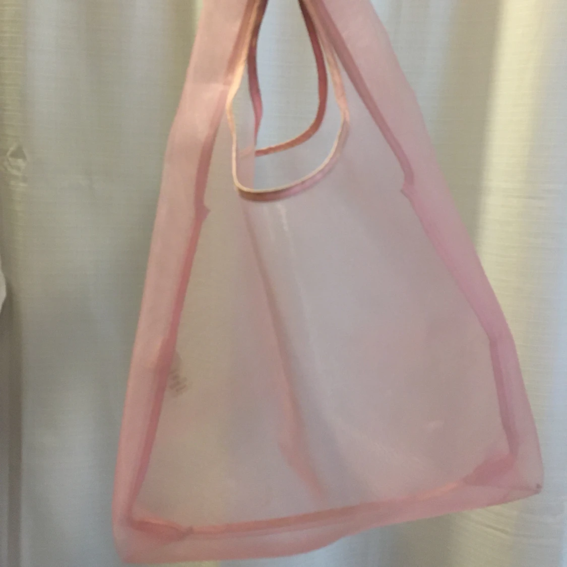 Kasse i ljusrosa polyester. Genomskinlig. Lite slitage och smuts vid handtagen och vissa fläckar på kassen, i övrigt hel.