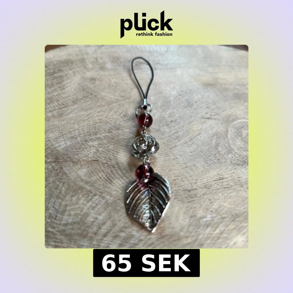 Väsksmycke/phone-charm av glaspärlor, silverlöv och rostfritt stål🪻🍃💍
