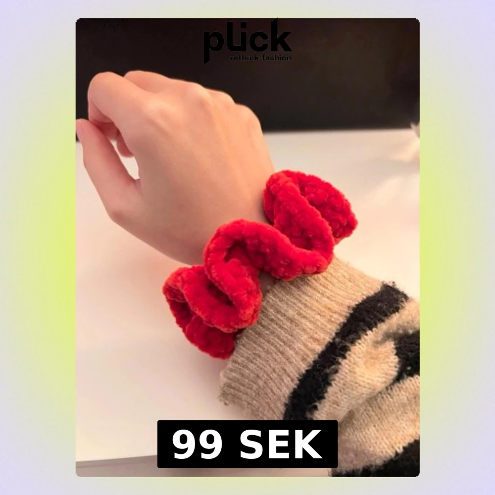 Mjuk och härlig Velvet scrunchie i färgen röd. Virkad av mig. Kan användas för att sätta upp håret eller som accessoar tex, som armband 🎀