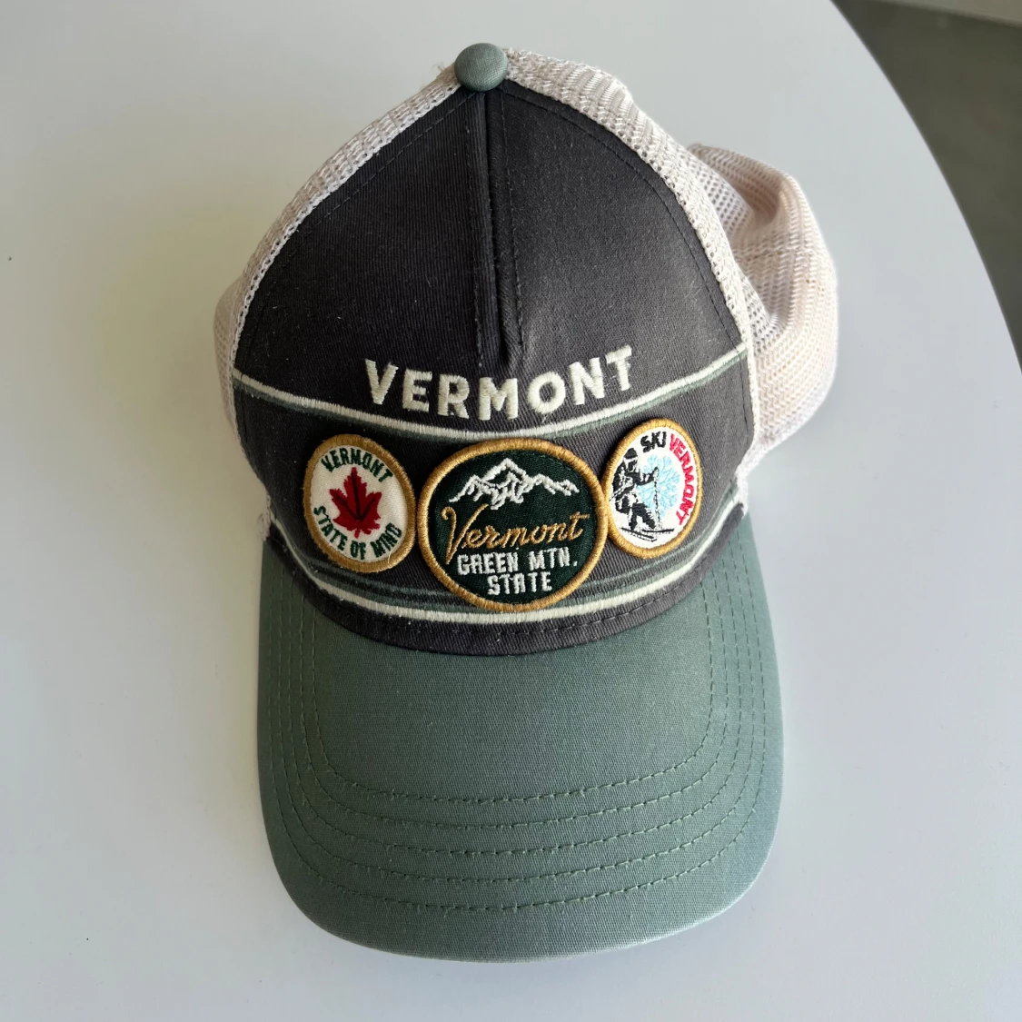 Snygg keps med broderade märken och texten 'VERMONT' framtill. Framsidan är mörkgrå med grönt brätte och baksidan är beige mesh med justerbar knäppning. Märkena har motiv från Vermont och Green Mountain State.