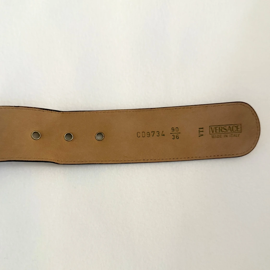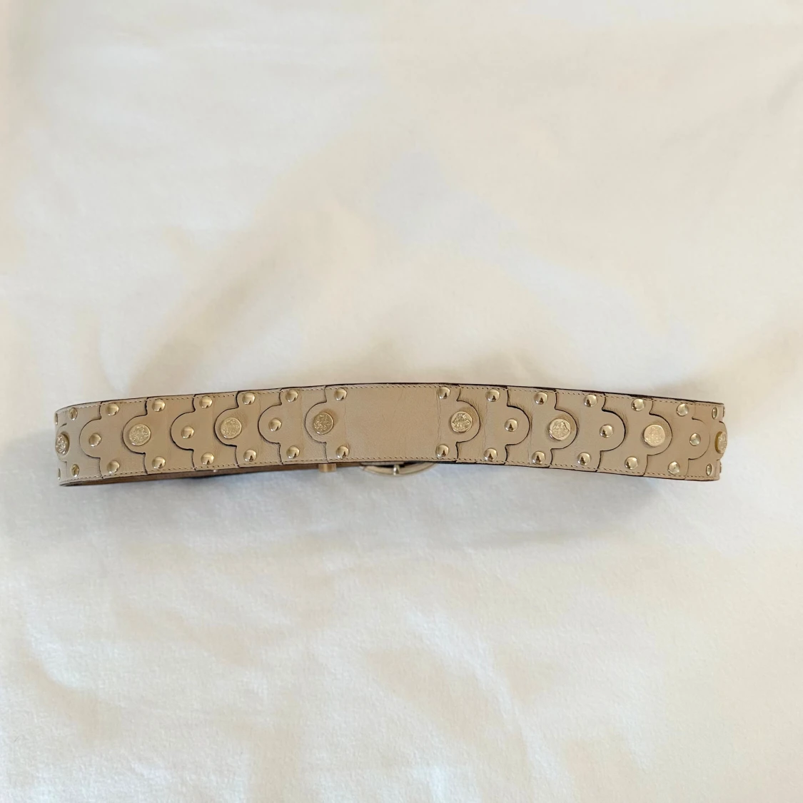 ♡ Gorgeous incredibly rare vintage beige leather studded belt from Versace S/S (Spring/Summer) 2006 runway collection. ♡ There is a small curve that has formed from wear and is not at all visible when actually wearing the belt. The curve is from closing the belt and putting it through the oval buckle.