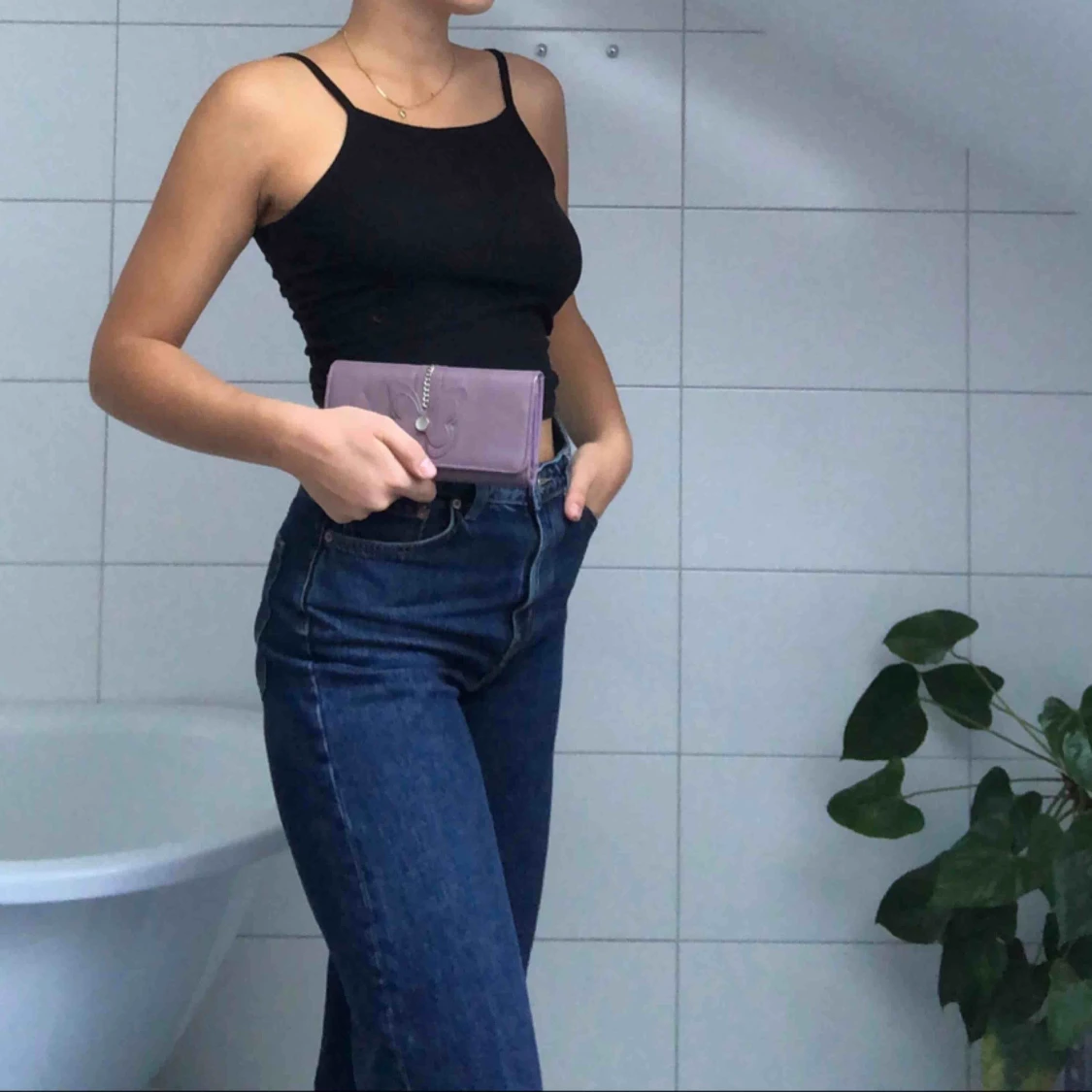 En lila plånbok med en broderad fjäril på. Har mycket plats inuti för både kontanter, kort och ett ID-fodral!
