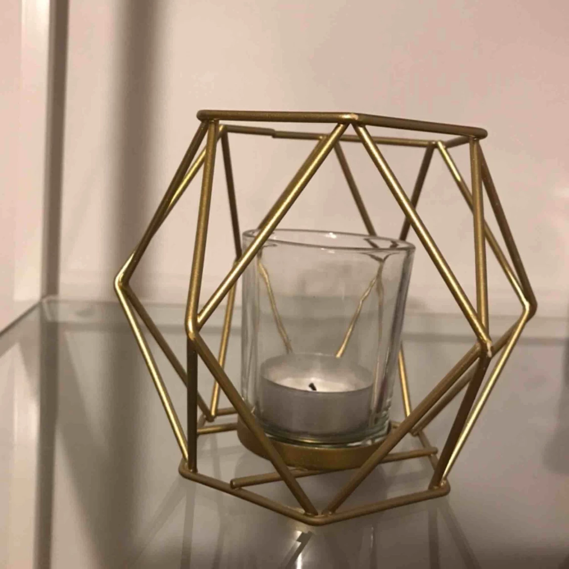 En jättefin ljushållare som är guldfärgad. Man lägger i egna värmeljus i glaset