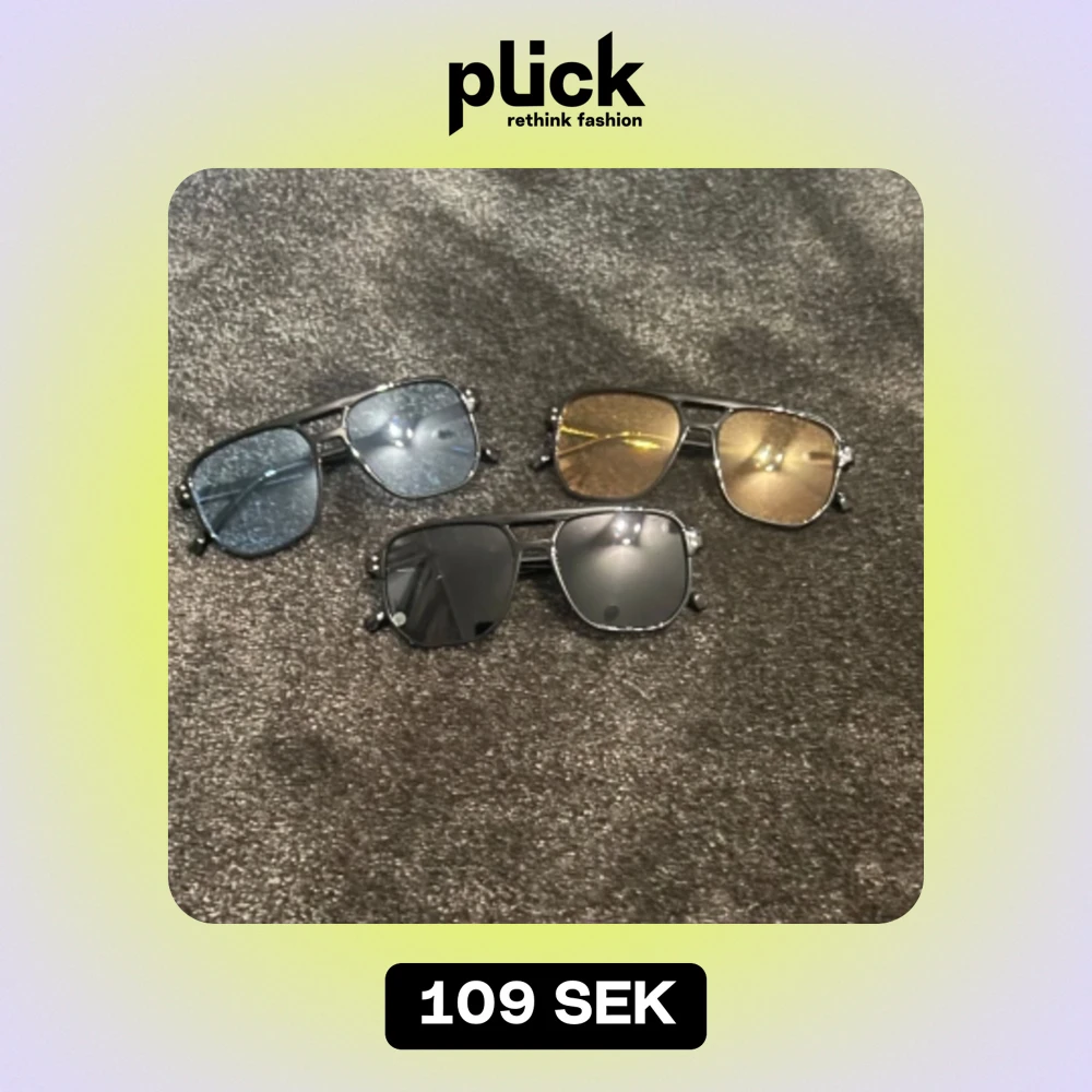 Säljer tre par stiliga solglasögon med metallbågar. Ett par har blåtonade glas, ett par har guldfärgade glas och det sista paret har mörktonade glas. Perfekta för både sommar och vår, och ger en cool look till vilken outfit som helst. Alla glasögon har en klassisk design med en modern twist.