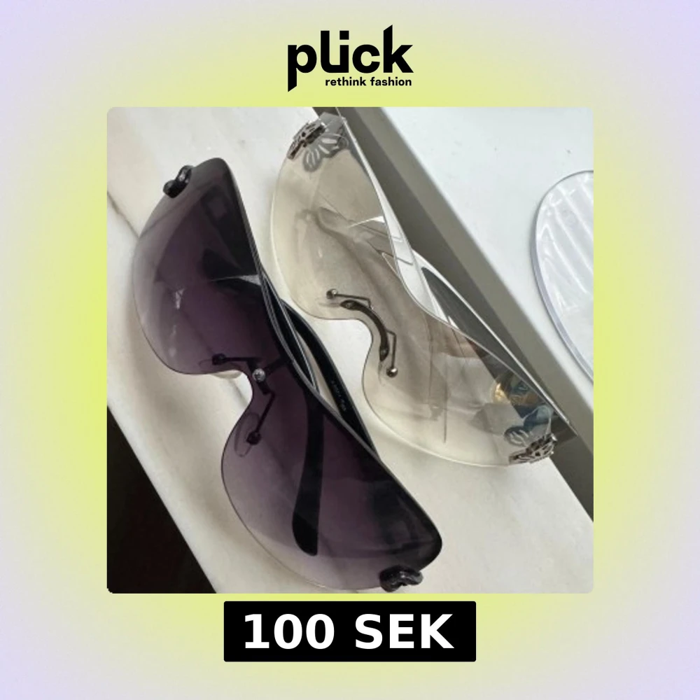 Två par vintage solglasögon med futuristisk design. Ena paret har mörkbruna, nästan svarta glas och det andra har ljusbeige, transparenta glas. Båda har metalliska detaljer vid sidorna och saknar tydliga bågar runt glasen. 1 för 60kr. 2 för 100kr