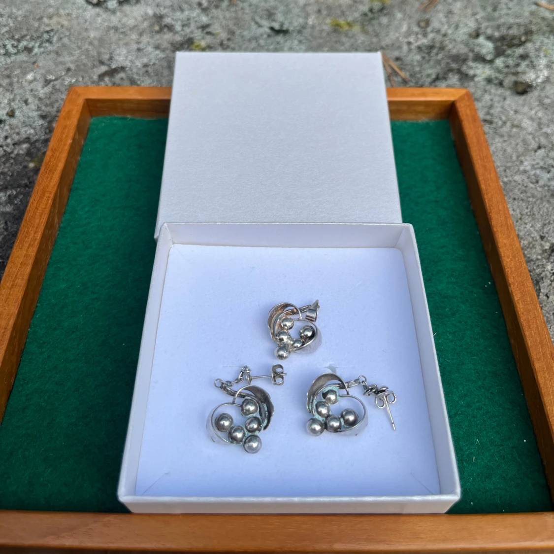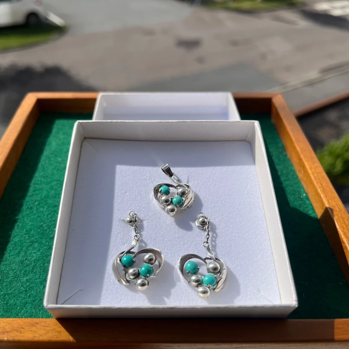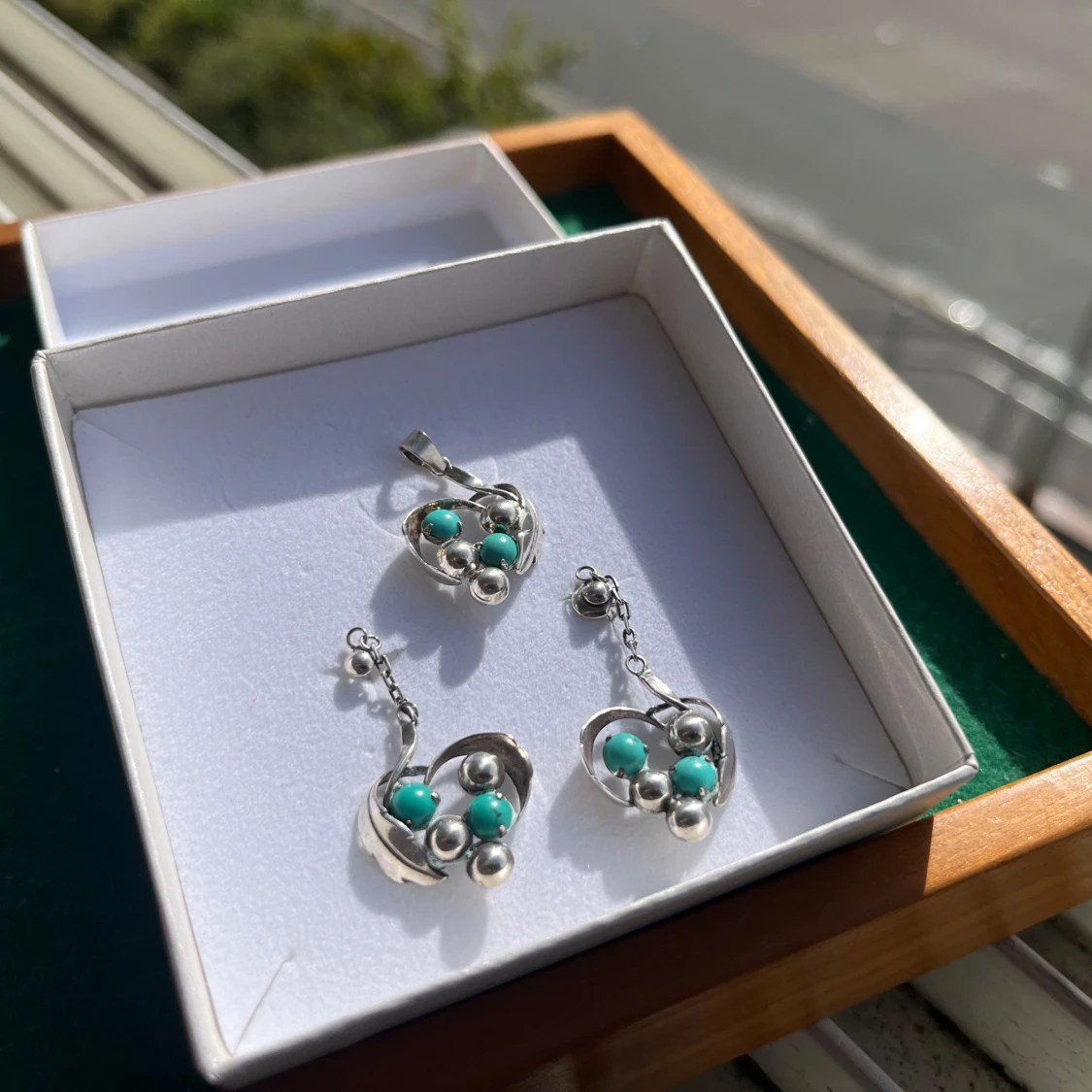 Superfina silver örhängen och ett hänge. Alla är silverstämplade ” 925”. Totalvikten på både hänget och örhängena är 5 gram. Längden på hänget är 3 cm och längden på örhängena är 4,5 cm. Har superfina turkosa cirklar i hjärtformen. Är i bruksskick och har tecken på slitage, se bilder för egen bedömning. Hör av er vid frågor!💕 Box medföljer ej.