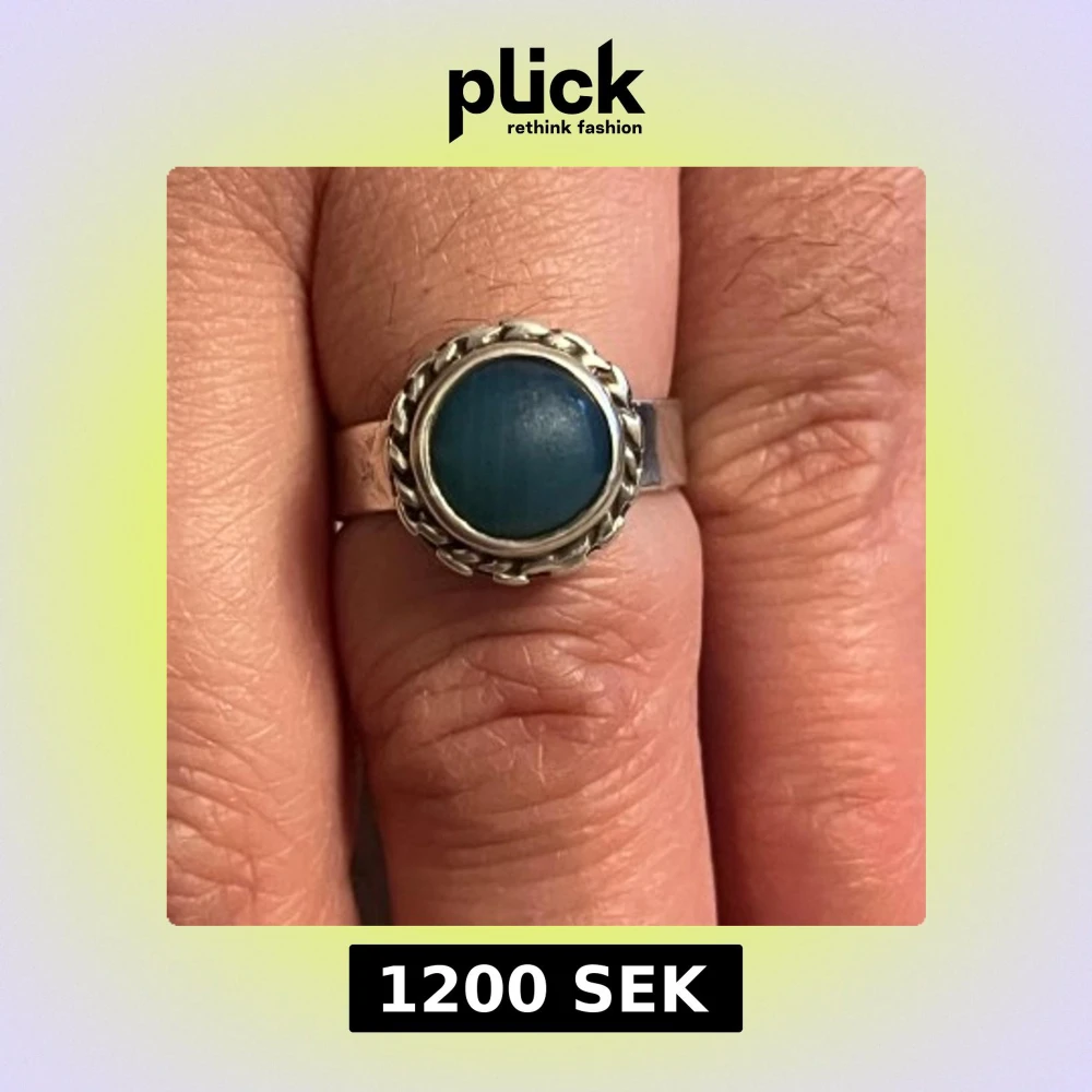 Elegant silverring med en rund blå sten i mitten, omgiven av en flätad detalj. Ringen har stämplar på insidan som indikerar äkthet och kvalitet. Perfekt för att ge en stilfull touch till din look.