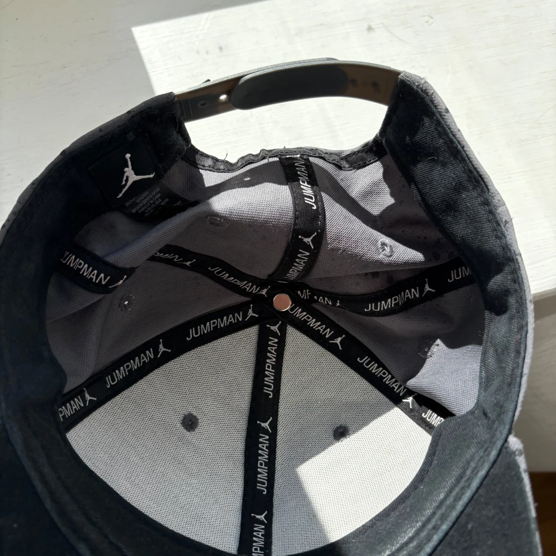 Snygg grå keps med svart stänkmönster och Jumpman-logga framtill. Justerbar passform med spänne bak. Perfekt för en sportig look eller casual stil.