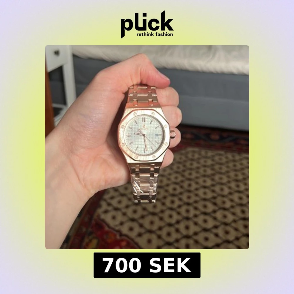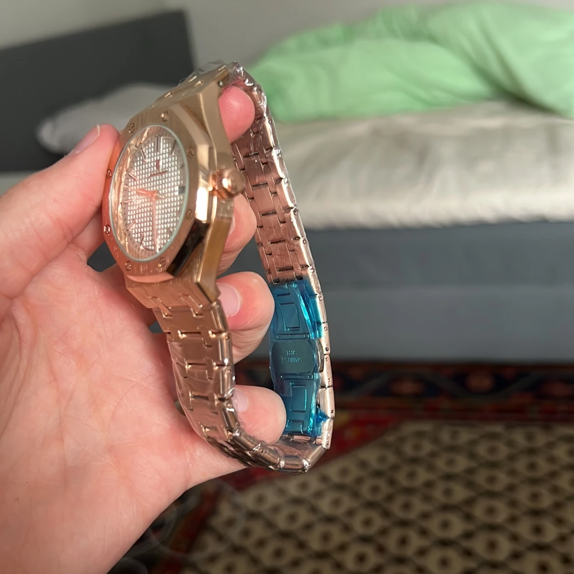 Snygg klocka som ska likna Audemars Piguet (AP)s Royal Oak modell, o jag tycker de har lyckats rätt bra. Länkverktyg följer med så att du kan justera länkarna så klockan passar dig perfekt. (Plasten är kvar, därför armbandet ser plastigt ut på bilderna)