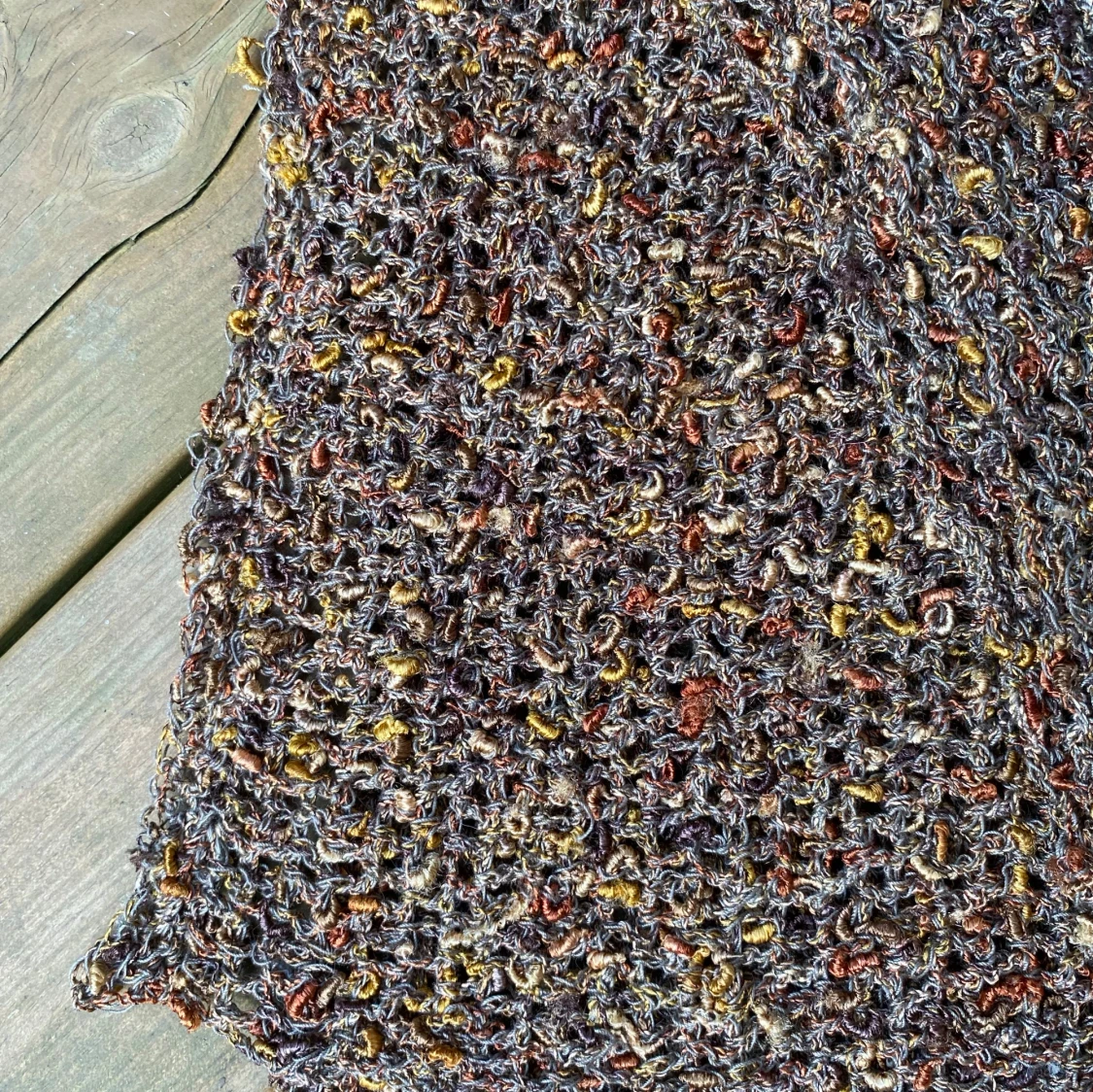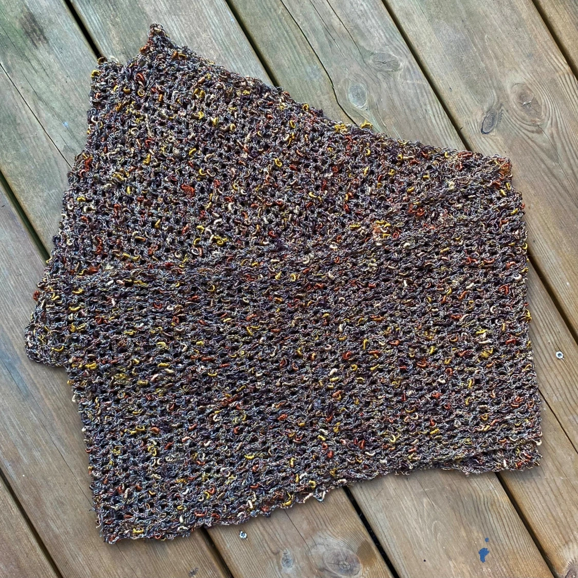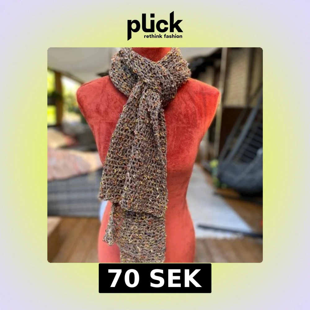 Handvirkad halsduk i ett unikt mönster med inslag av brunt, gult och orange. Perfekt för att addera en personlig touch till din outfit. Ca 160 x 28 cm Inga bilder när den sitter på mig! Katter finns i hemmet!