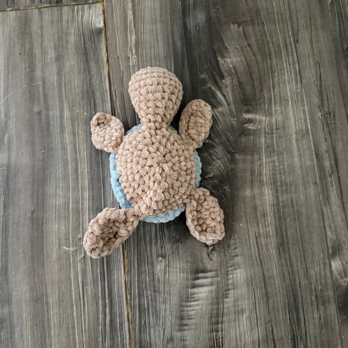 En handvirkad mjukissköldpadda i beige och ljusblått garn. Perfekt som present eller dekoration.