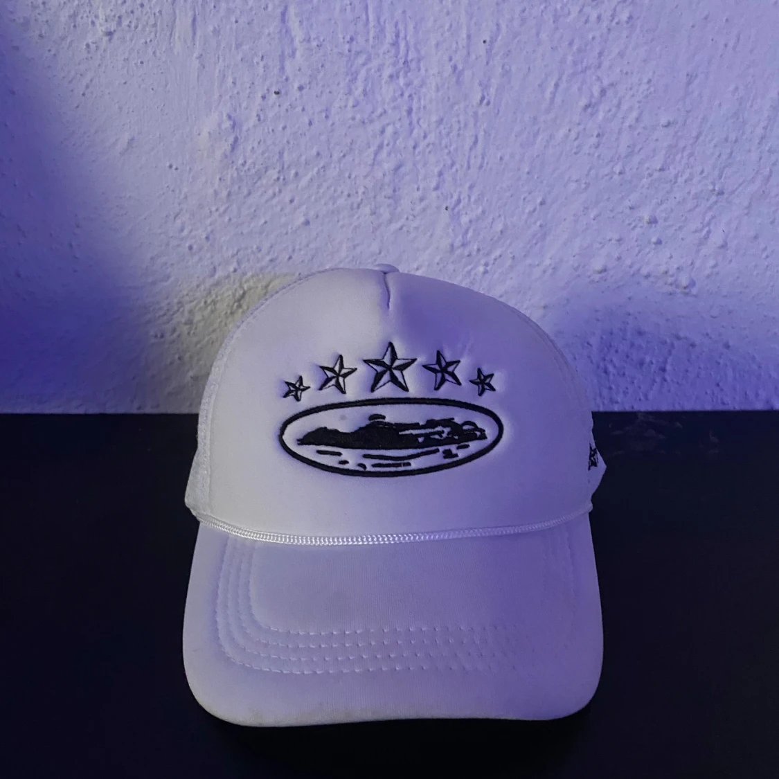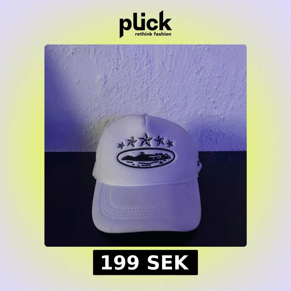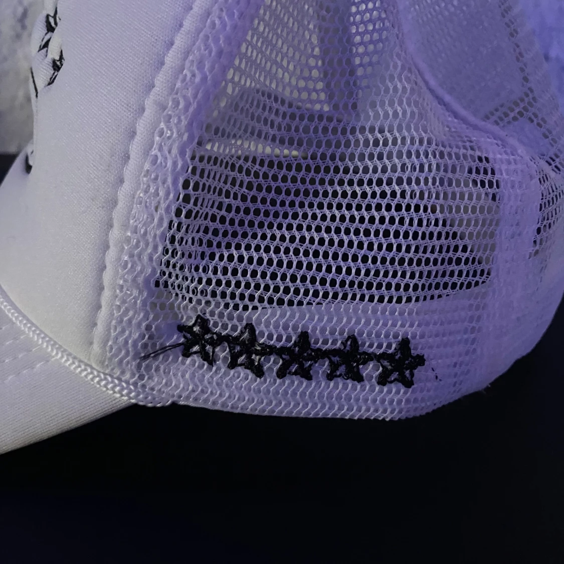 Snygg vit keps med mesh på sidorna och bak, dekorerad med svarta broderade stjärnor både framtill och på sidan. Framtill finns även ett svart broderat motiv med stjärnor ovanför. Perfekt för dig som vill sticka ut med en unik och fräsch keps.