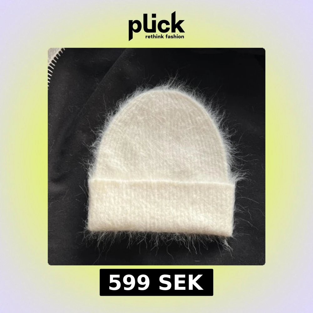 Mysig vit mössa i fluffigt material, perfekt för kyliga dagar. Den har en enkel design med uppvikt kant som ger extra värme och stil.