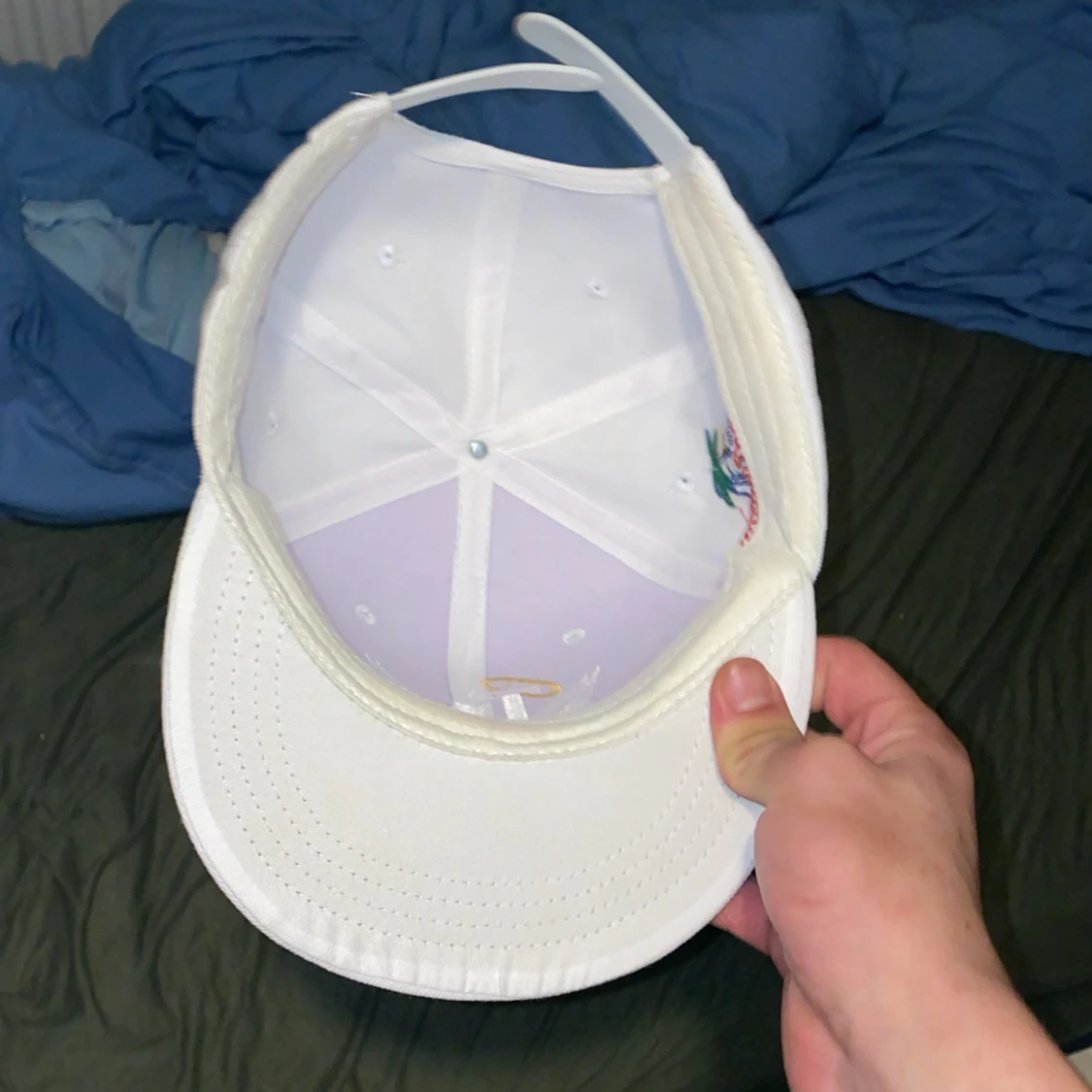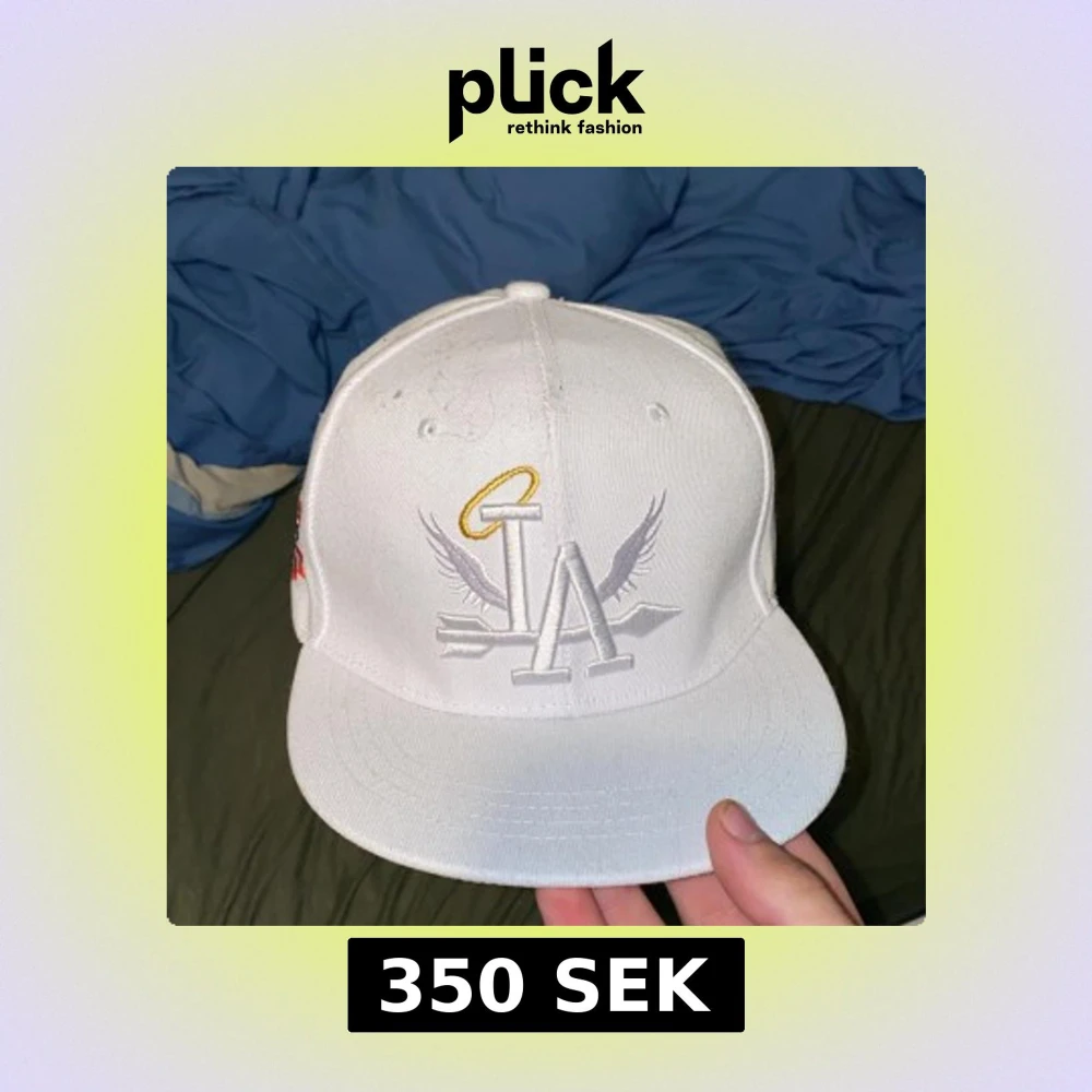 Snygg vit snapback-keps med broderat LA-logo framtill, dekorerad med vingar och en gul gloria. På sidan finns färgglatt broderi med texten 'World Champs' och palmer. Justerbar passform med plastspänne. Perfekt för dig som gillar streetwear och sportig stil.