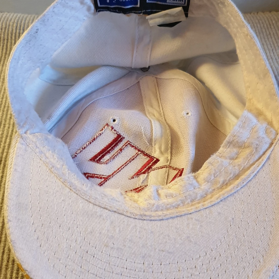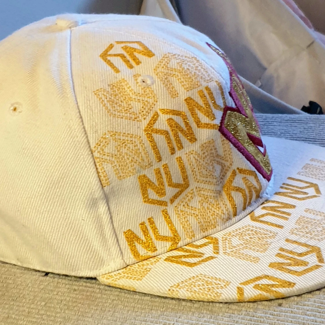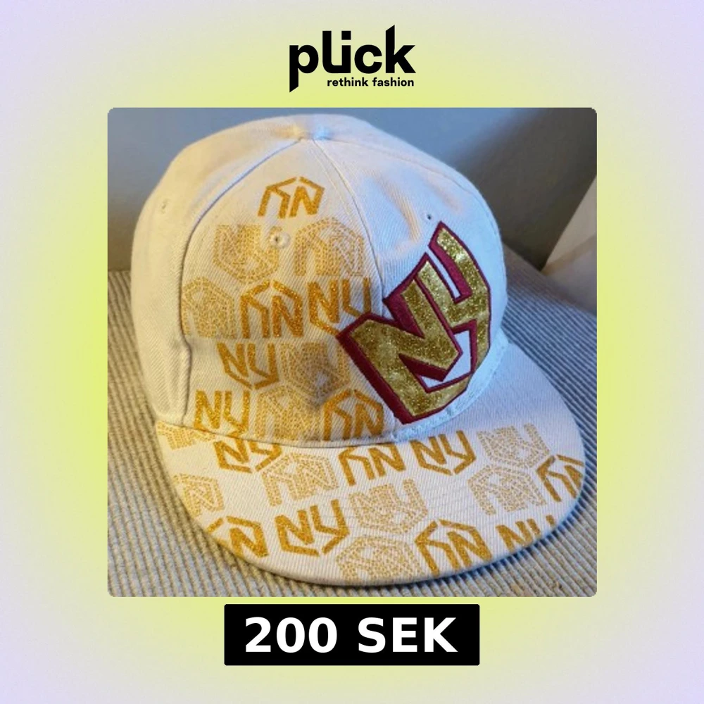 Snygg vit keps New york med ett unikt guldmönster och en stor broderad logga i guld och rött framtill. Perfekt för att ge din outfit en cool touch. Lite avskavt på texten men obefintligt. Strl 7 1/2 60 cm