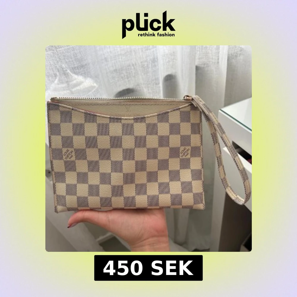 Säljer en snygg kuvertväska i beige och grått rutigt mönster. Väskan har dragkedja upptill, avtagbar handledsrem och röd insida. Perfekt för att bära det viktigaste med stil.