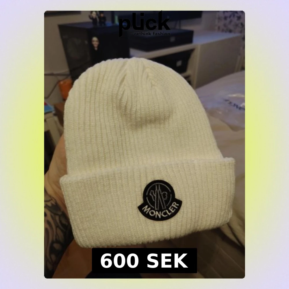 Säljer en snygg vit ribbad mössa från Moncler med uppvikt kant och svart broderad logga framtill. Perfekt för dig som vill ha en clean och stilren look med exklusiv känsla. Materialet är stickat och mjukt.
