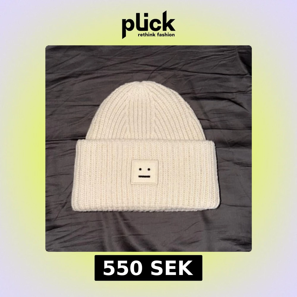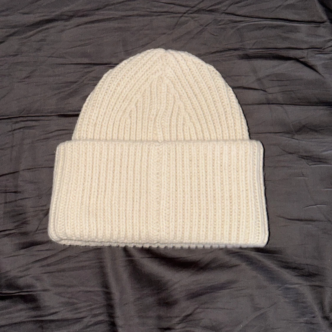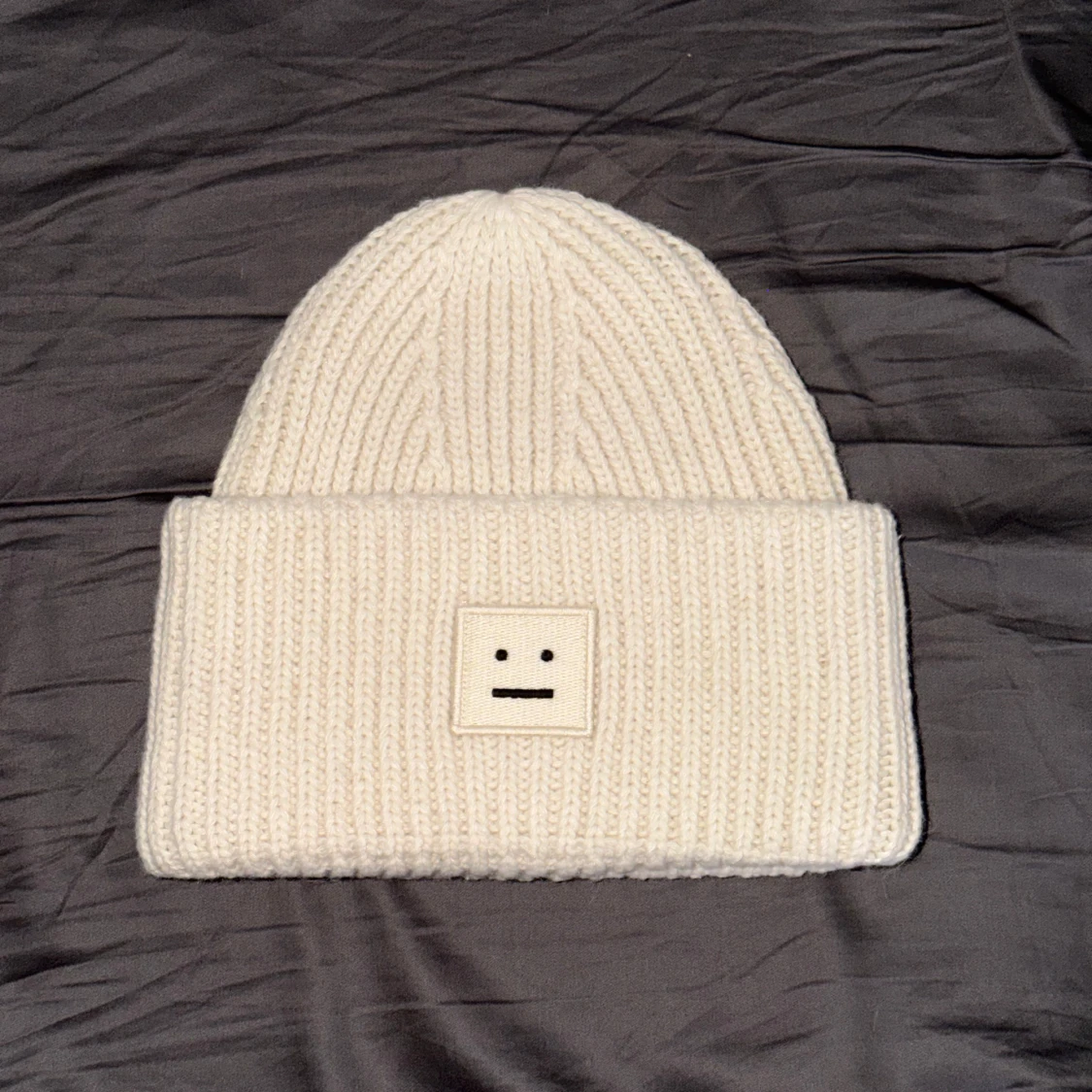 Vit ribbstickad mössa från Acne Studios med bred uppvikt kant och det ikoniska ansiktsloggan framtill. Tillverkad i mjuk ull som håller dig varm och snygg under kalla dagar. Perfekt accessoar för en clean och stilren look.