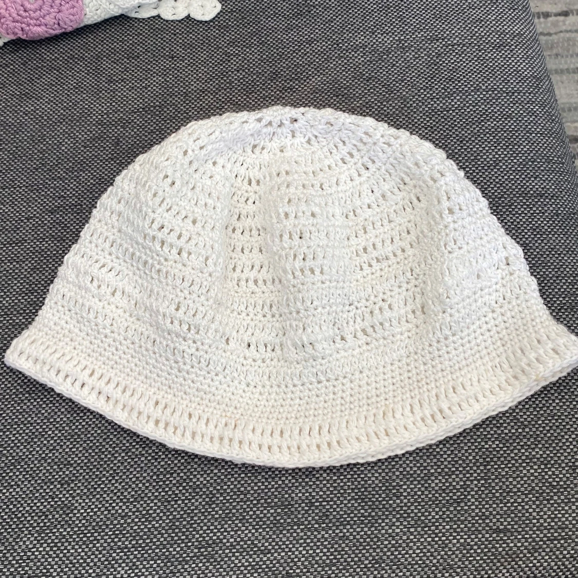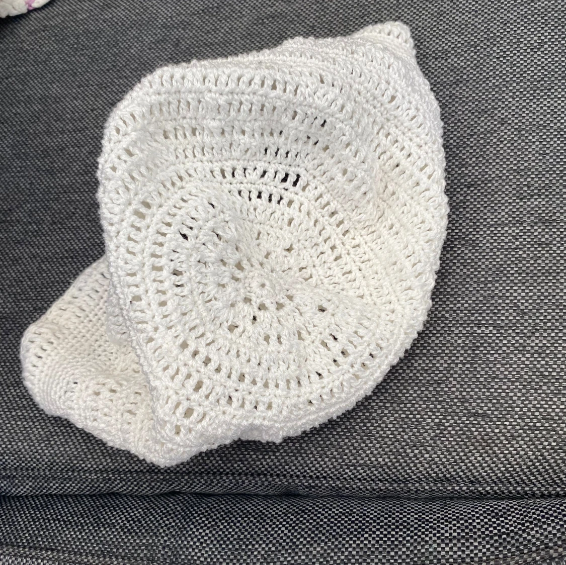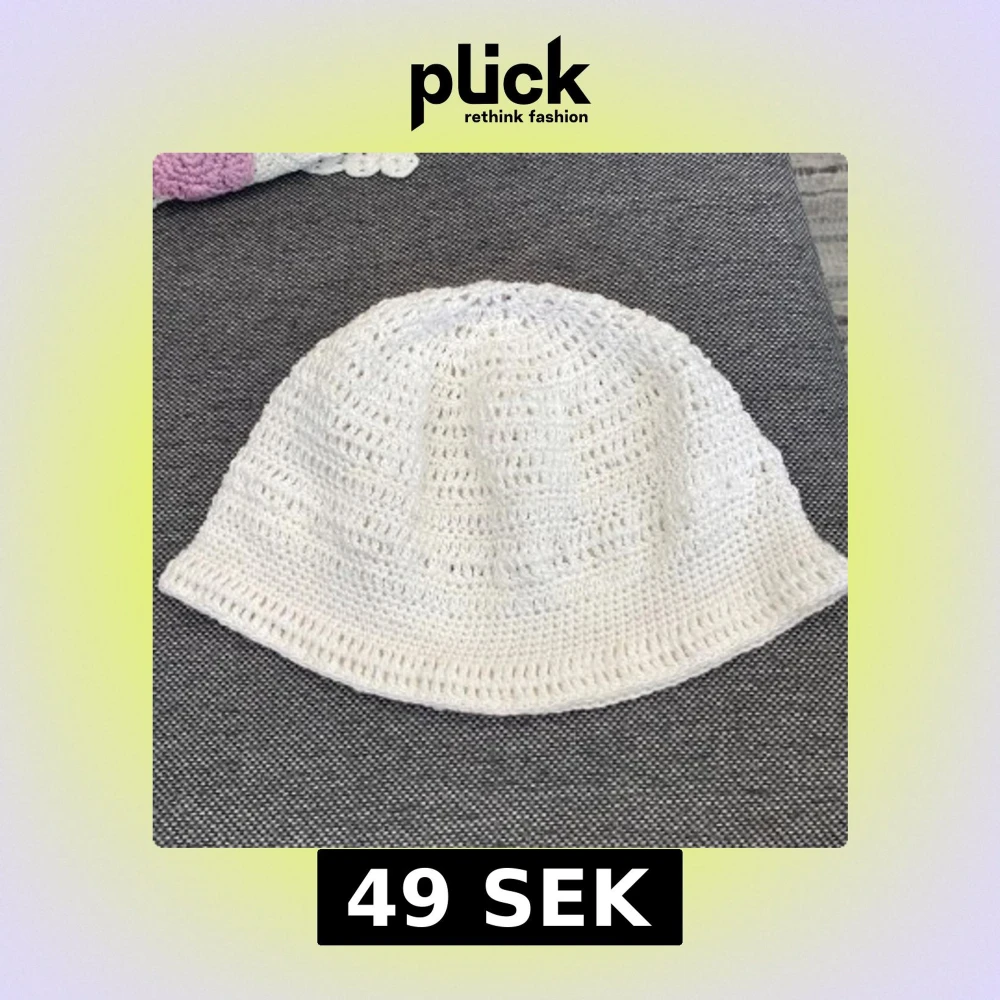 Vit, virkad hatt. Perfekt för soliga dagar eller som ett stilfullt tillbehör. 100% bomull 19x56 cm Inga bilder när den sitter på mig! Katter finns i hemmet! Kan ej skicka med UPS!