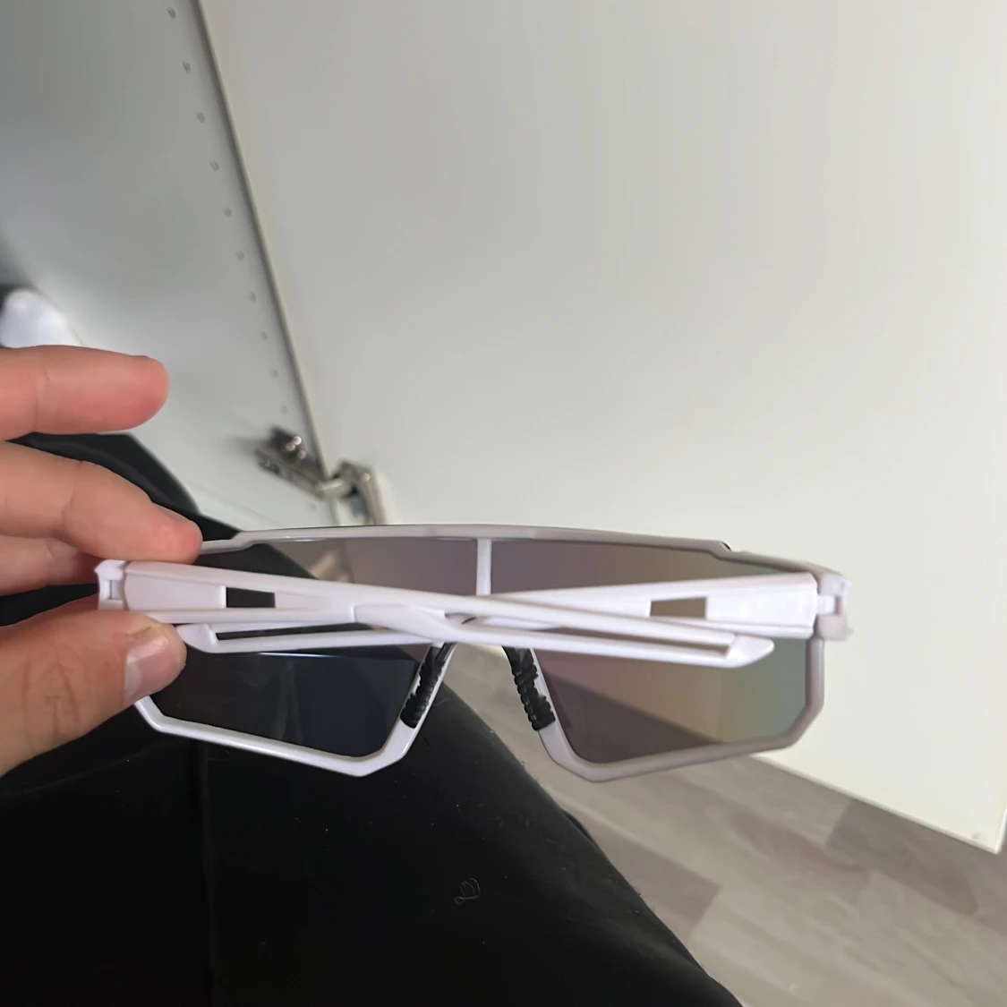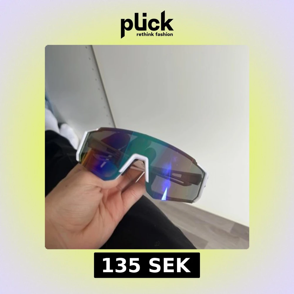 Säljer ett par sportiga solglasögon med vit ram och stora spegelglas i blått och grönt. Glasögonen har en futuristisk design med bred båge och passar perfekt för träning eller utomhusaktiviteter.