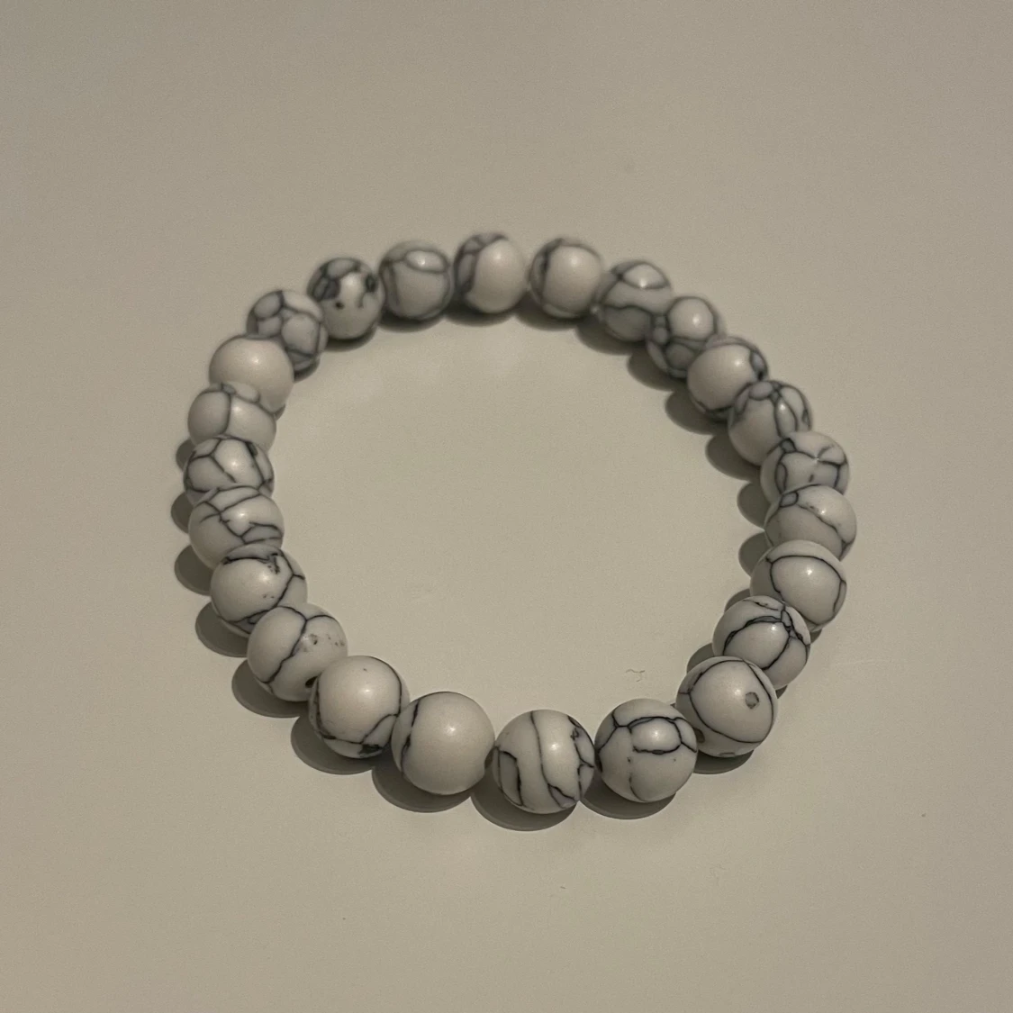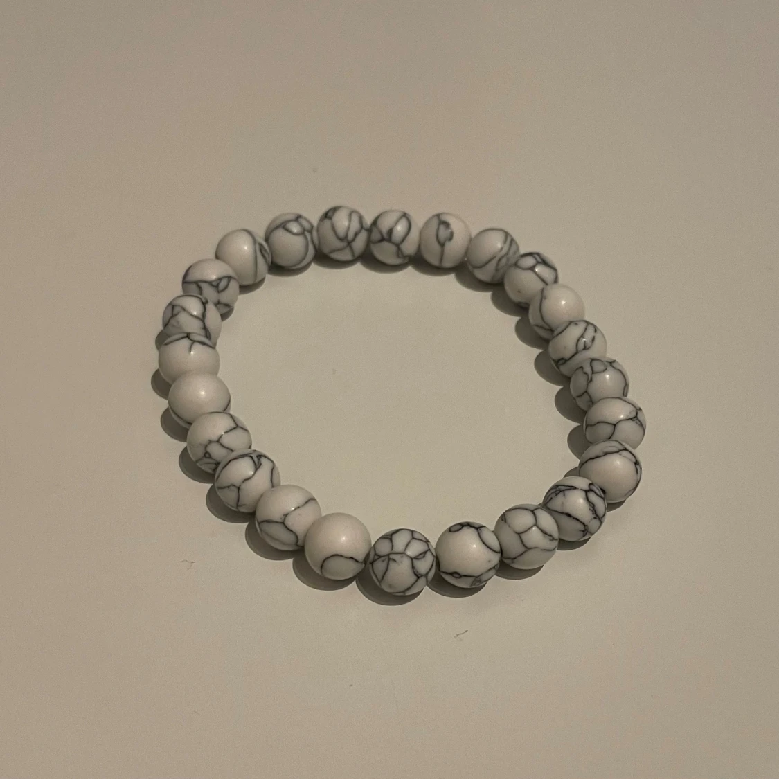 Snyggt armband med vita marmorerade pärlor. Mycket bra kvalite och stretchig material.