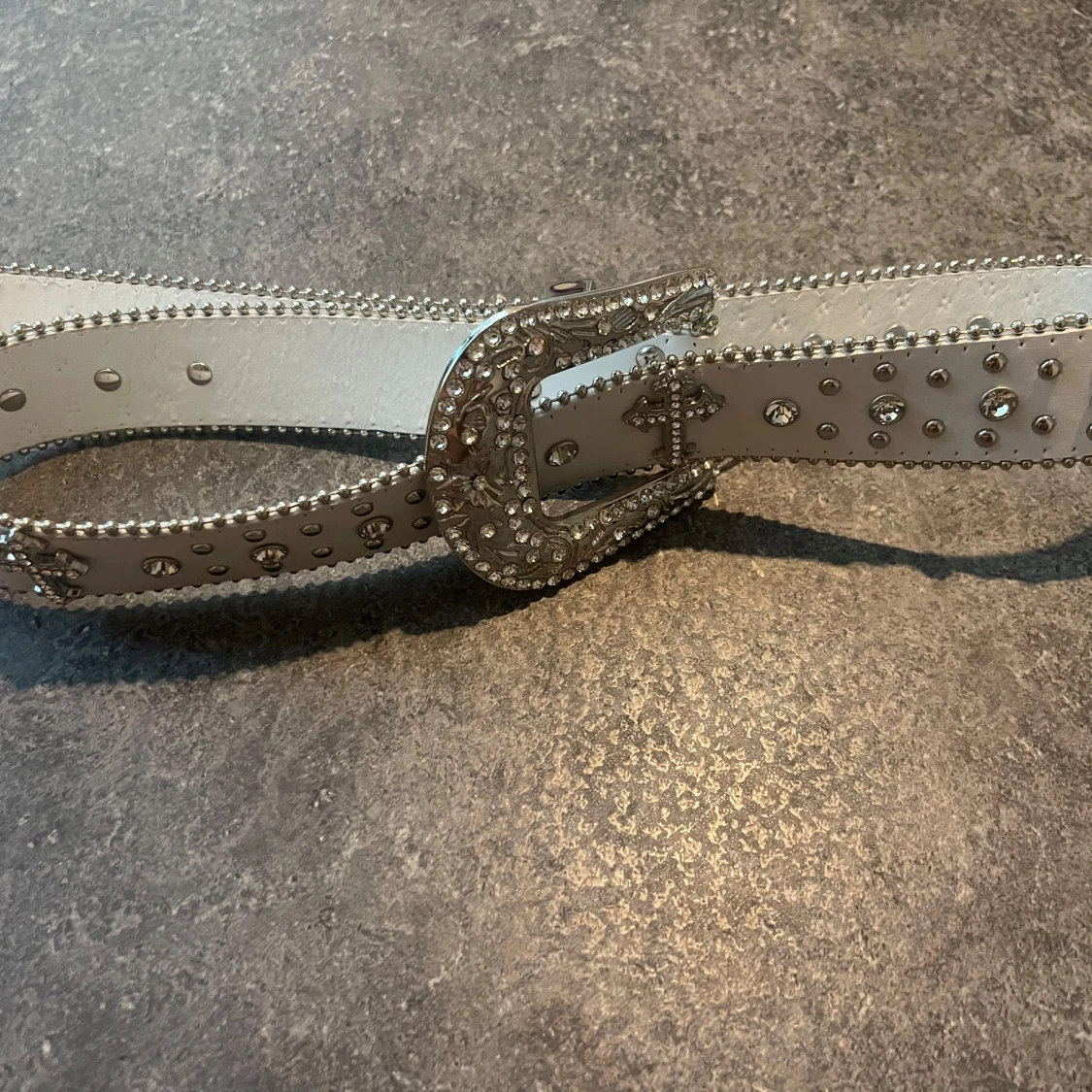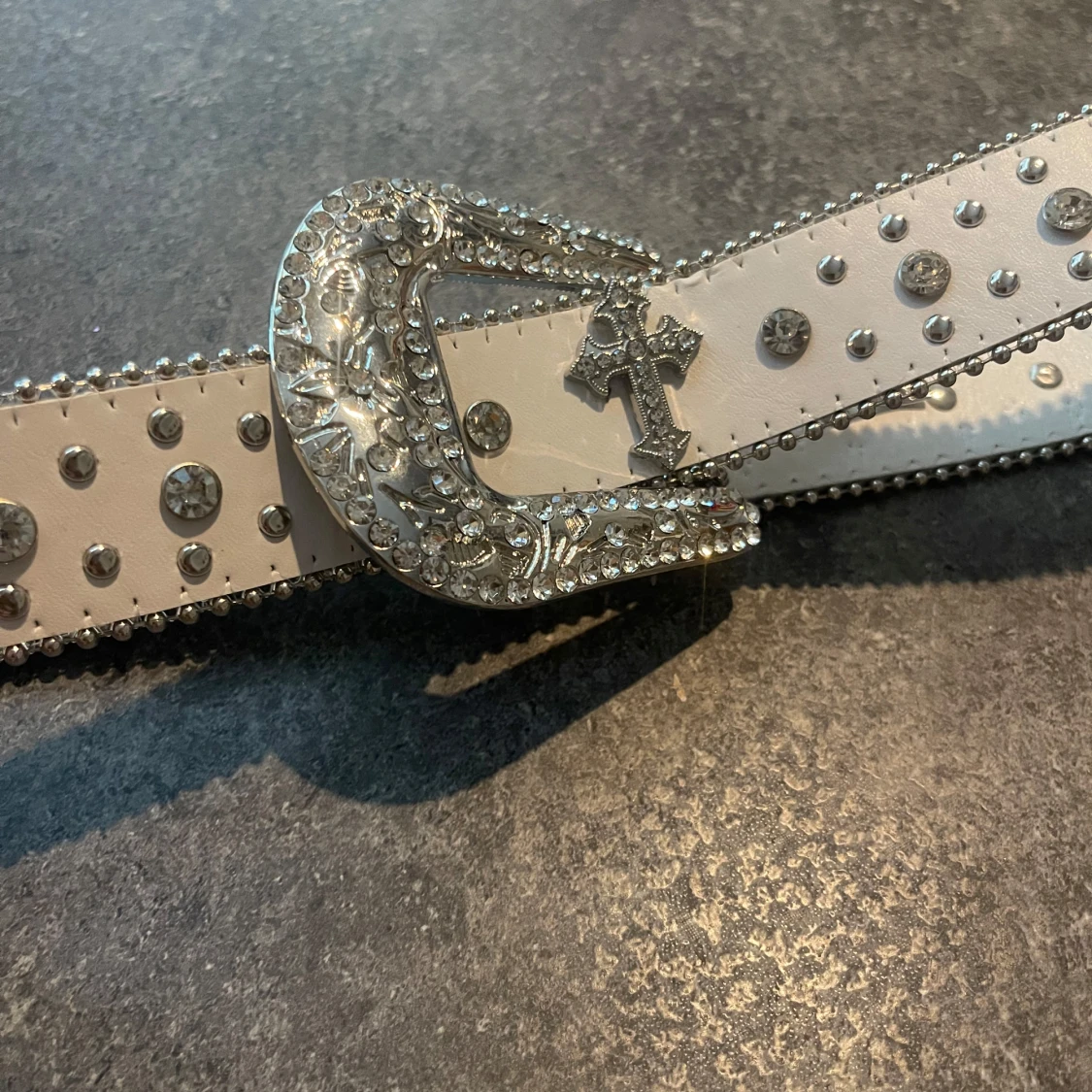 Säljer ett vitt bälte med glittrande detaljer och ett stort, dekorerat spänne i silver med strass och kors. Bältet har silverfärgade nitar och pärlor längs kanterna som ger en extra bling-effekt. Aldrig använt