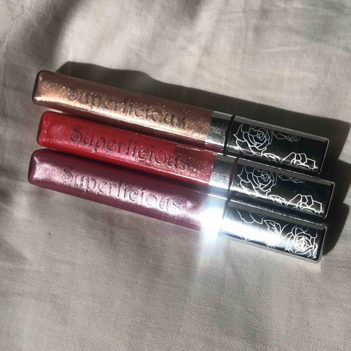 Superfina läppglans ”Superlicious” från märket Viva La Diva. Har fått massa av dem men använder tyvärr inte. Dessa är i glittriga färger och alla innehåller Aloe Vera och E-vitamin. Luktar gött sött💞 50kr/st 2 st för 90 kr möts upp i Göteborg🥰
