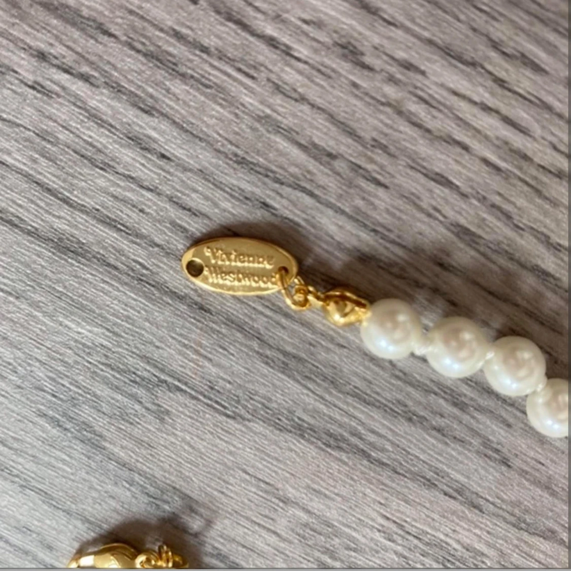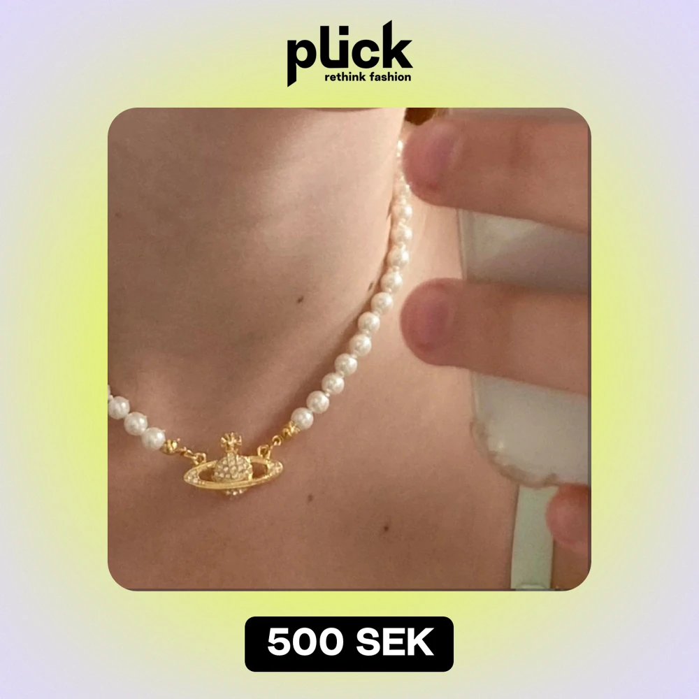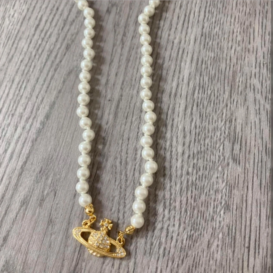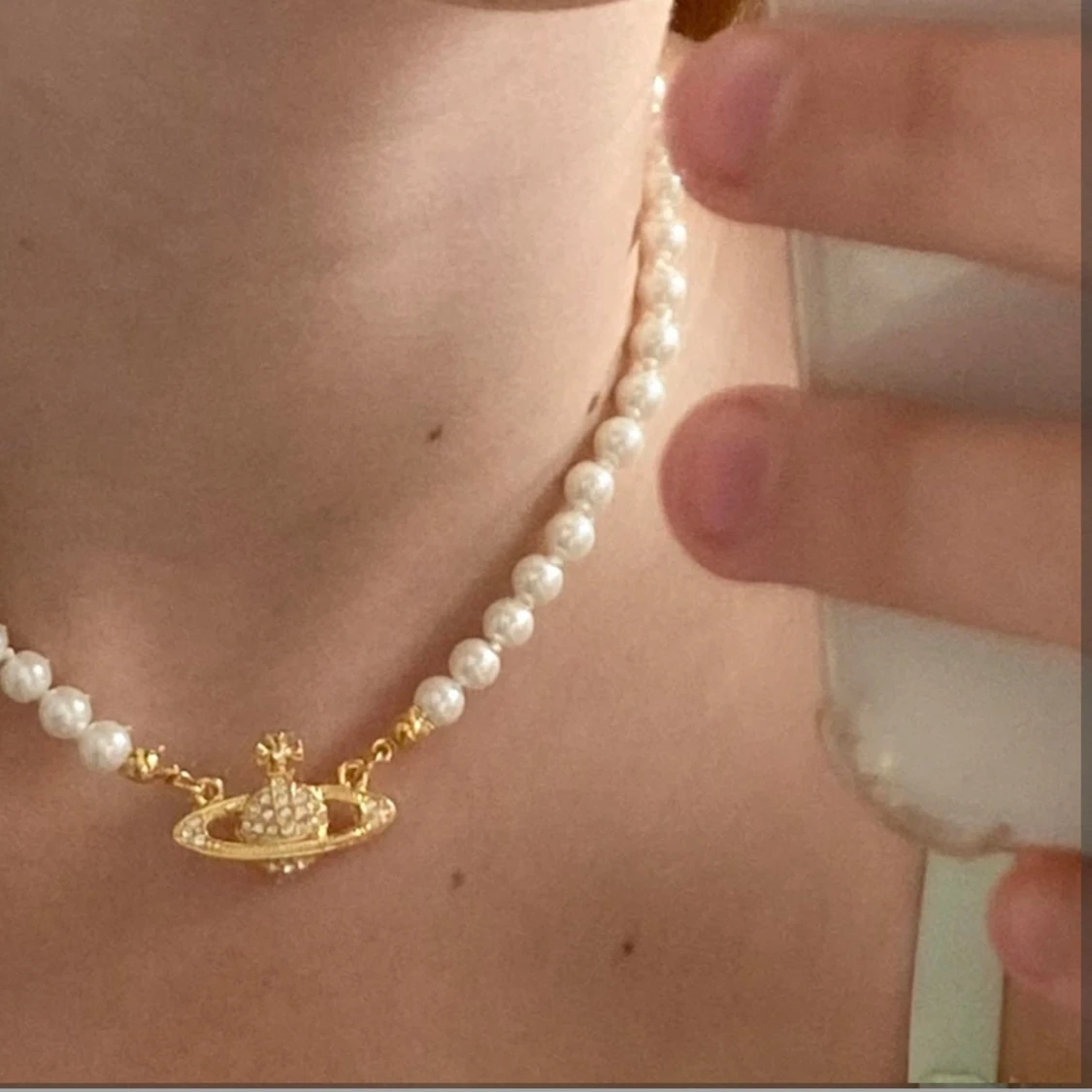 Säljer ett pärlhalsband från Vivienne Westwood med en ikonisk guldberlock i form av en planet. Halsbandet har vita pärlor och en fin guldfärgad låsdetalj. Perfekt för att ge något extra till vilken outfit som helst. Passar både till vardag och fest!