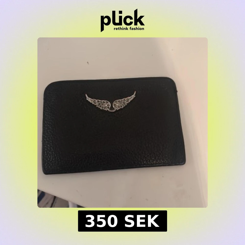 Svart plånbok från Zadig & Voltaire i skinn med silverfärgad vinge framtill. Plånboken är köpt på Jackie för några år sedan, kan därför inte hitta kvitto men skulle aldrig köpa något fejk. Köptes för 900kr men säljer för 350kr. Har inga ”defekter” men man ser att den inte är sprillans ny.