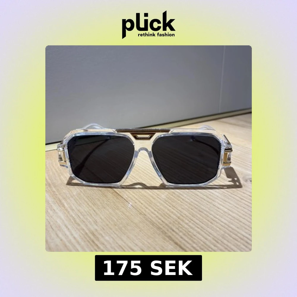 Snygga solglasögon med transparent båge och rektangulära svarta glas. Guldiga metalldetaljer vid gångjärnen och ovansidan ger en lyxig känsla. Ramen är kantig och modern, perfekt för dig som vill sticka ut med din stil. Pris 175 plus frakt.