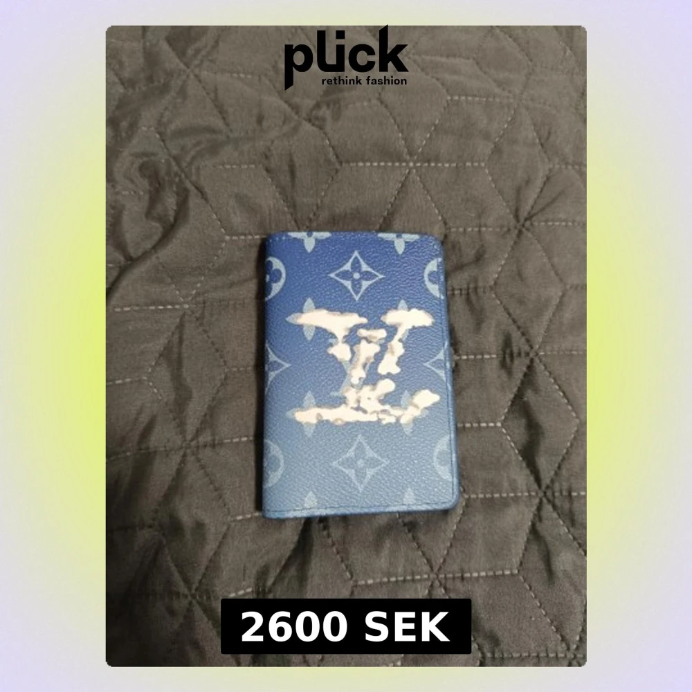 Snygg blå plånbok från Louis Vuitton med klassiskt monogrammönster och stor LV-logga i vitt på framsidan. Tillverkad i skinn med flera kortfack och stilren design. Perfekt accessoar för dig som vill sticka ut med något exklusivt och trendigt.
