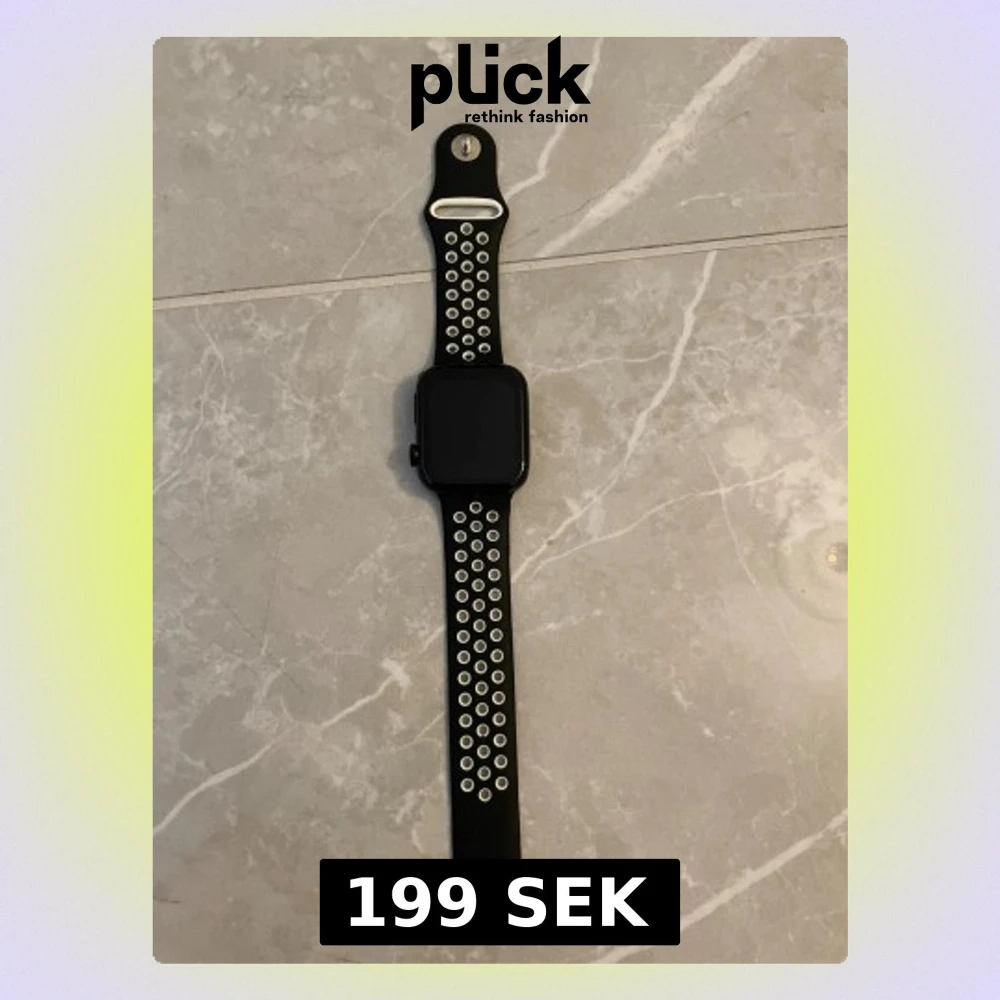 Snygg Apple Watch med svart fyrkantig urtavla och sportigt silikonarmband i svart och vitt med hålmönster. Perfekt för dig som gillar tech och vill ha koll på träning, notiser och musik direkt på handleden. Men laddare ingår ej och att den går inte starta. Men det kanske är bara jag som har fel laddare 🔌.
