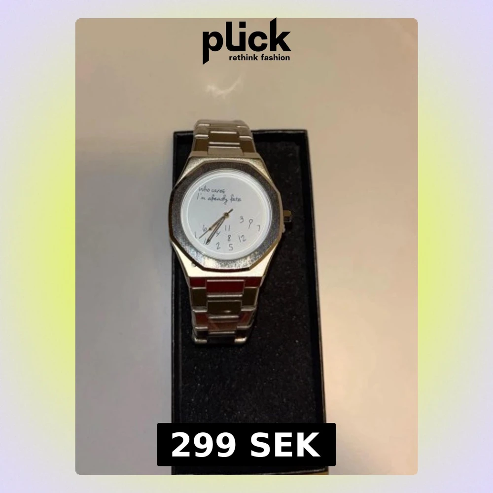 Silvrig Rolex liknande klocka med texten 'Who cares, I'm already late' på urtavlan och ett metallarmband.