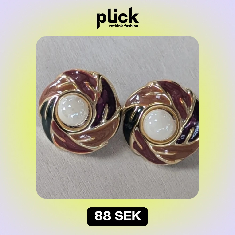 Ett par runda clipsörhängen med en central pärla omgiven av ett virvlande mönster i guld, lila, svart och brunt. Örhängena har en elegant och unik design, Mycket Fint skick