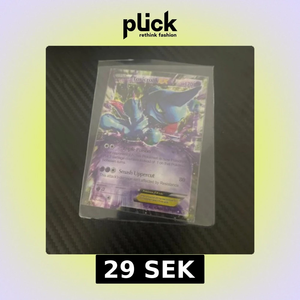 Säljer ett Toxicroak EX Pokémonkort med 170 HP. Kortet har attacker som Triple Poison och Smash Uppercut. Perfekt för samlare eller spelare som vill förstärka sin kortlek. Kortet är i en skyddande plastficka.