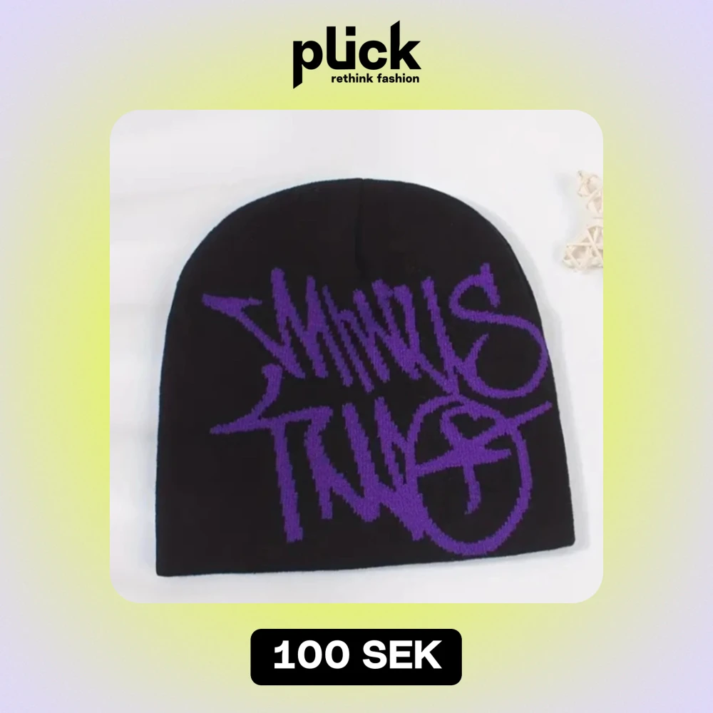 Cool svart mössa med stor lila text i graffiti-stil. Perfekt för att hålla sig varm och stilren under kyliga dagar. Passar både till vardags och för att ge en edgy touch till din outfit.