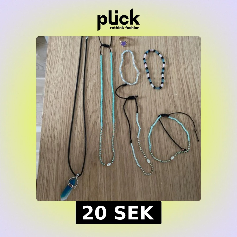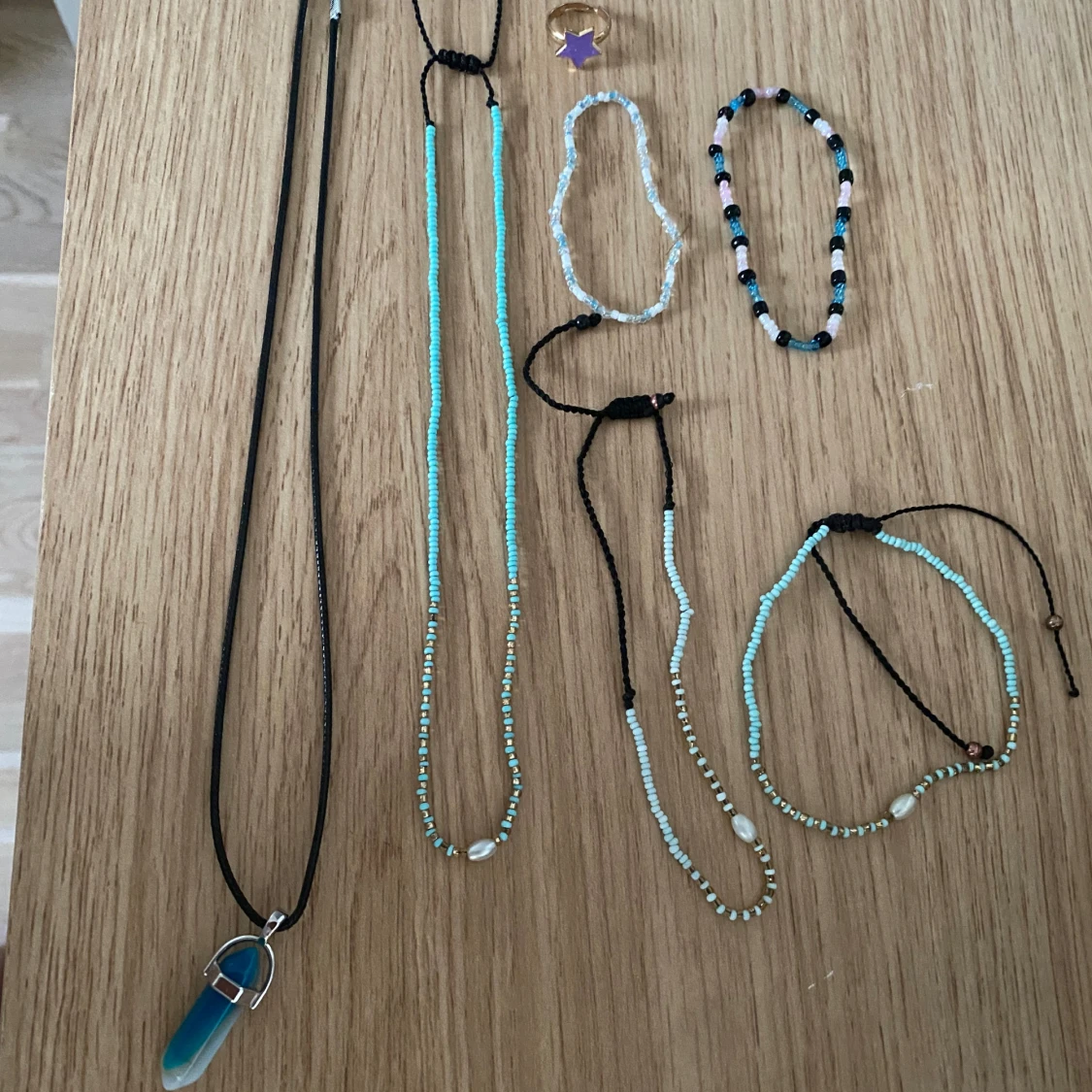 Säljer ett set med smycken i temat blått, vitt och svart: två halsband, ett med blå kristallhänge och ett med små turkosa pärlor, samt fyra armband i blått, svart och vitt med pärldetaljer. En ring med lila stjärna ingår också. Perfekt för dig som gillar färgglada accessoarer.
