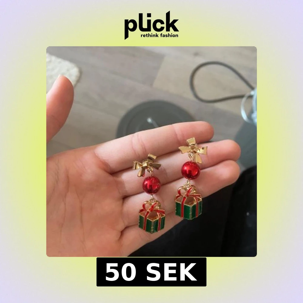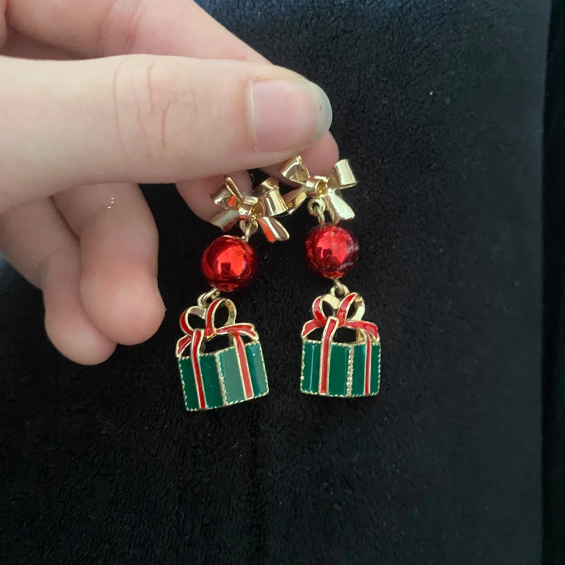 Superfina örhängen med guldiga rosetter, röda glittriga kulor och hängande gröna paket med röda band. Perfekta för att maxa julstämningen och sticka ut på alla vinterhäng. Färgerna är guld, röd och grön, och detaljerna är riktigt festliga.