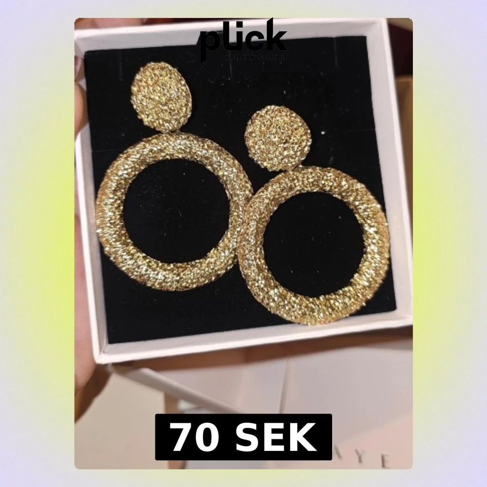 Säljer ett par stora, glittriga örhängen från Faye i guld. Örhängena har en rund form med en mindre cirkel upptill och en större cirkel nedtill, täckta av gnistrande glitter. Perfekta för dig som vill sticka ut och addera extra bling till din look.