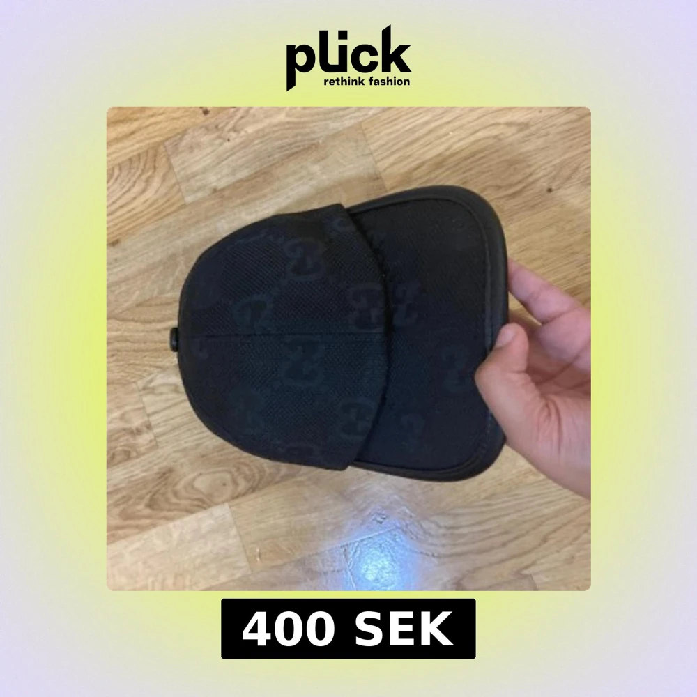 Säljer en svart keps med diskret över hela kepsen. Kepsen har en bred, rundad skärm och justerbar rem baktill i skinn. Materialet är slitstark bomull och skinn, perfekt för dig som gillar exklusiva streetwear-vibes.