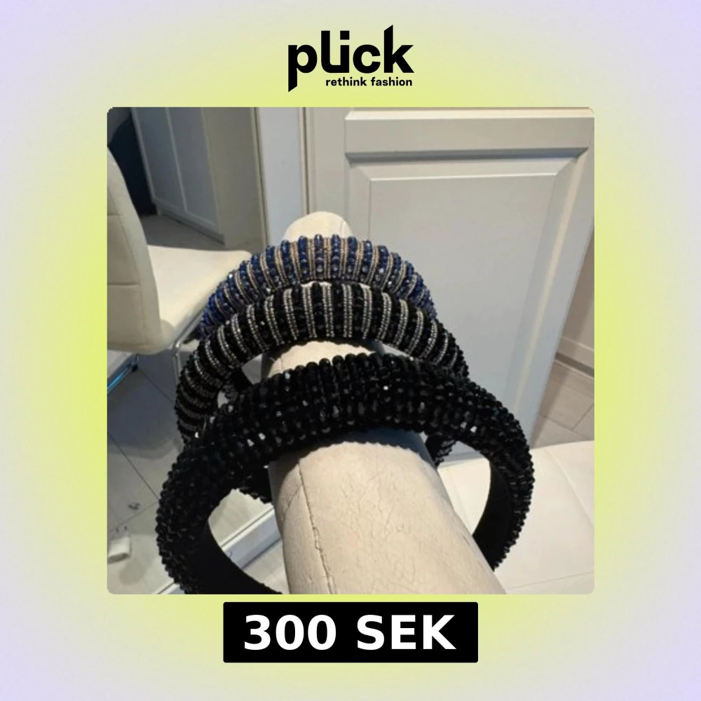 Säljer tre chunky diadem, ett helsvart med svarta pärlor, ett svart med silverfärgade och svarta pärlor i ränder samt ett svart med blå och silverfärgade pärlor i ränder. Alla är vadderade och täckta med glittriga pärlor för en extra statement-look. Oanvänt