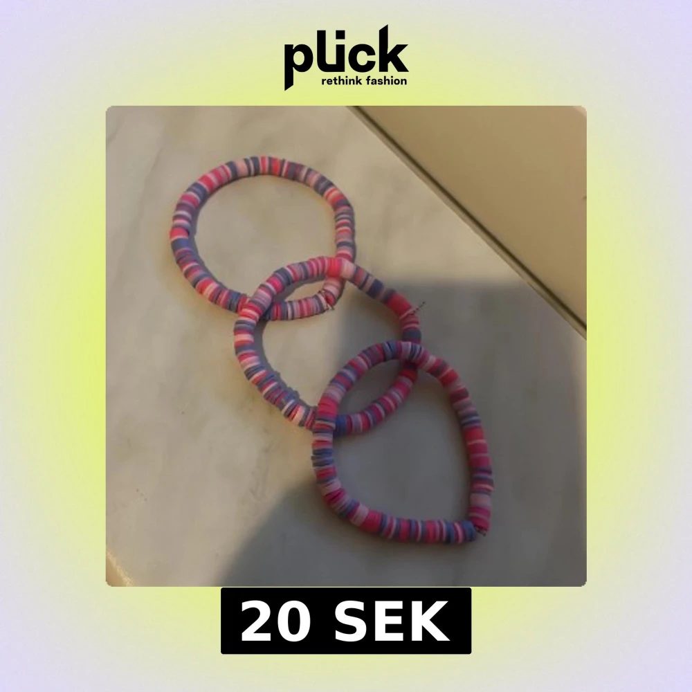 Säljer tre elastiska armband i mjukt tyg med randigt mönster i rosa, lila och vitt. Perfekta som accessoar för att liva upp din outfit. Passar både till vardag och när du vill ha något extra färgglatt.