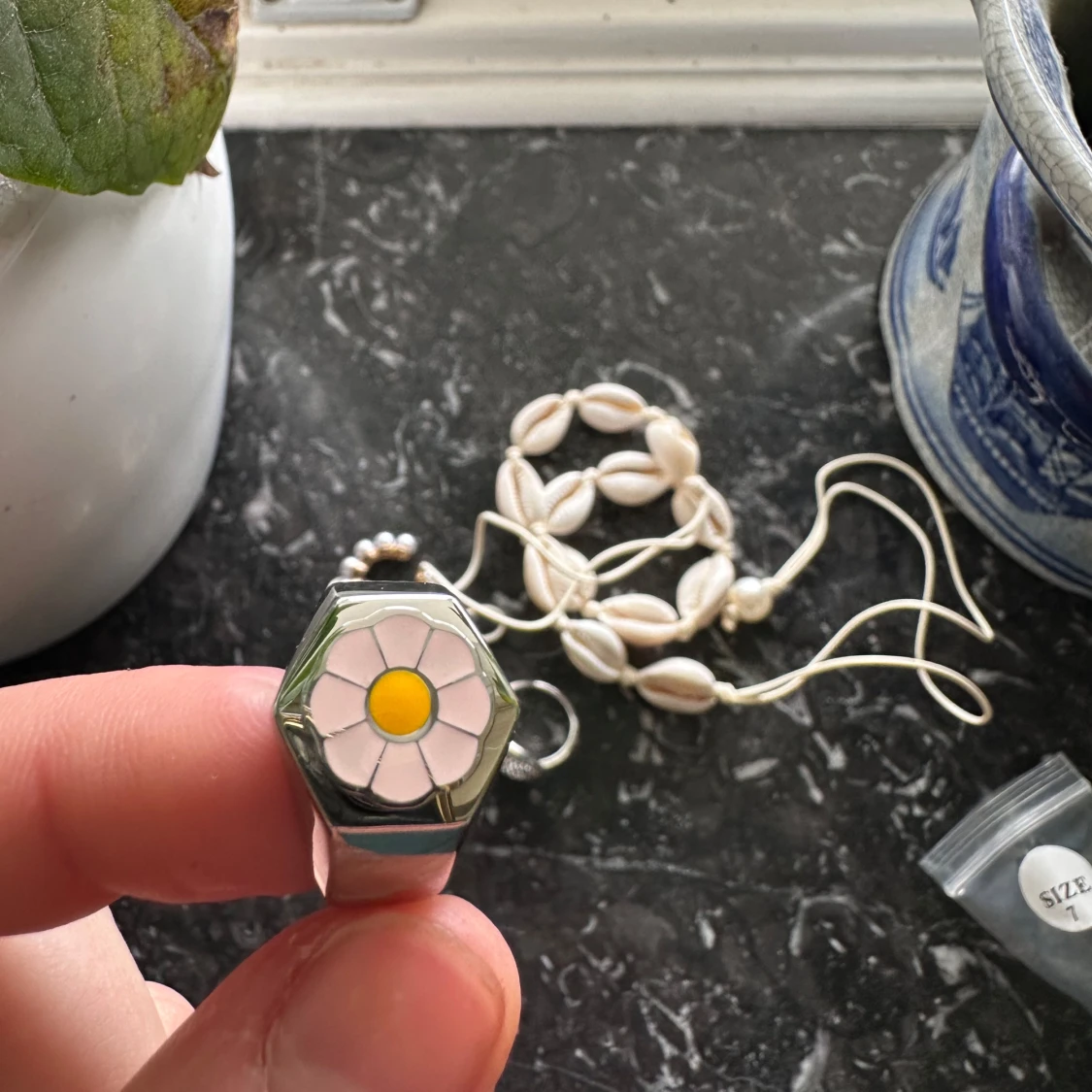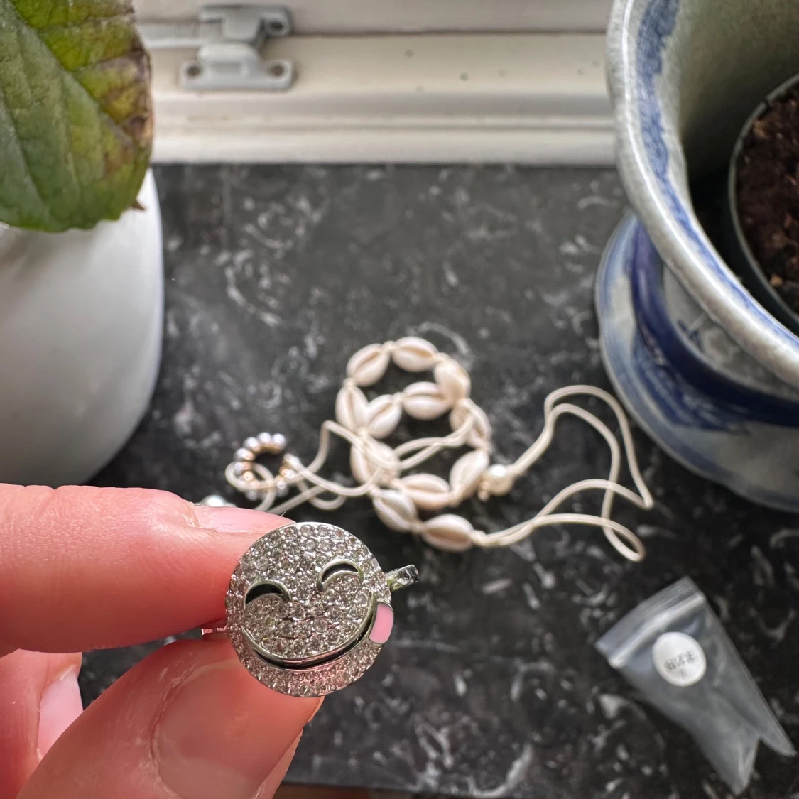 Säljer smycken från Zend Details. Ett vitt snäckhalsband med pärldetalj, en silverfärgad ring med blomma i vitt och gult, en glittrig ring med smiley och en öronring med pärlor och gulddetaljer.