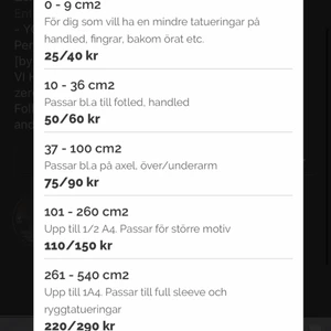 Här ser du hur vi räknar ut priserna på våra tatueringar. Köper du våra tryck är de något billigare, vill du designa din egen tatueringen får du kolla på det dyrare priset. Du väljer själv hur du vill utnyttja ytan. Du kan alltså köpa en stor tatuering för samma pris som fler små. Läs mer på vår hemsida (du hittar länk på instagram @zeroregrets.ud) eller hör av dig till oss så hjälper vi dig!