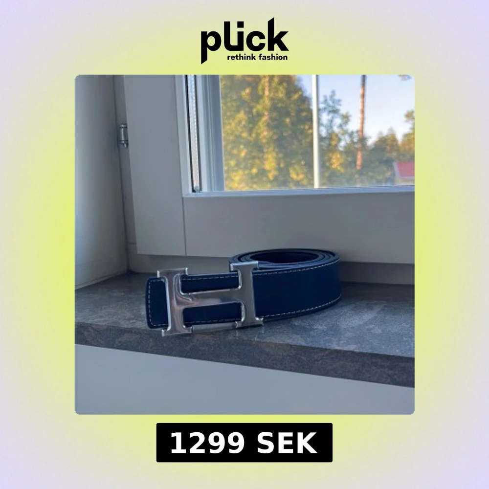 Säljer ett mörkblått skärp, i äkta skinn med ikoniskt silverfärgat H-spänne. Bältet har vit kontrastsöm längs kanterna och en stilren, klassisk design som lyfter vilken outfit som helst.