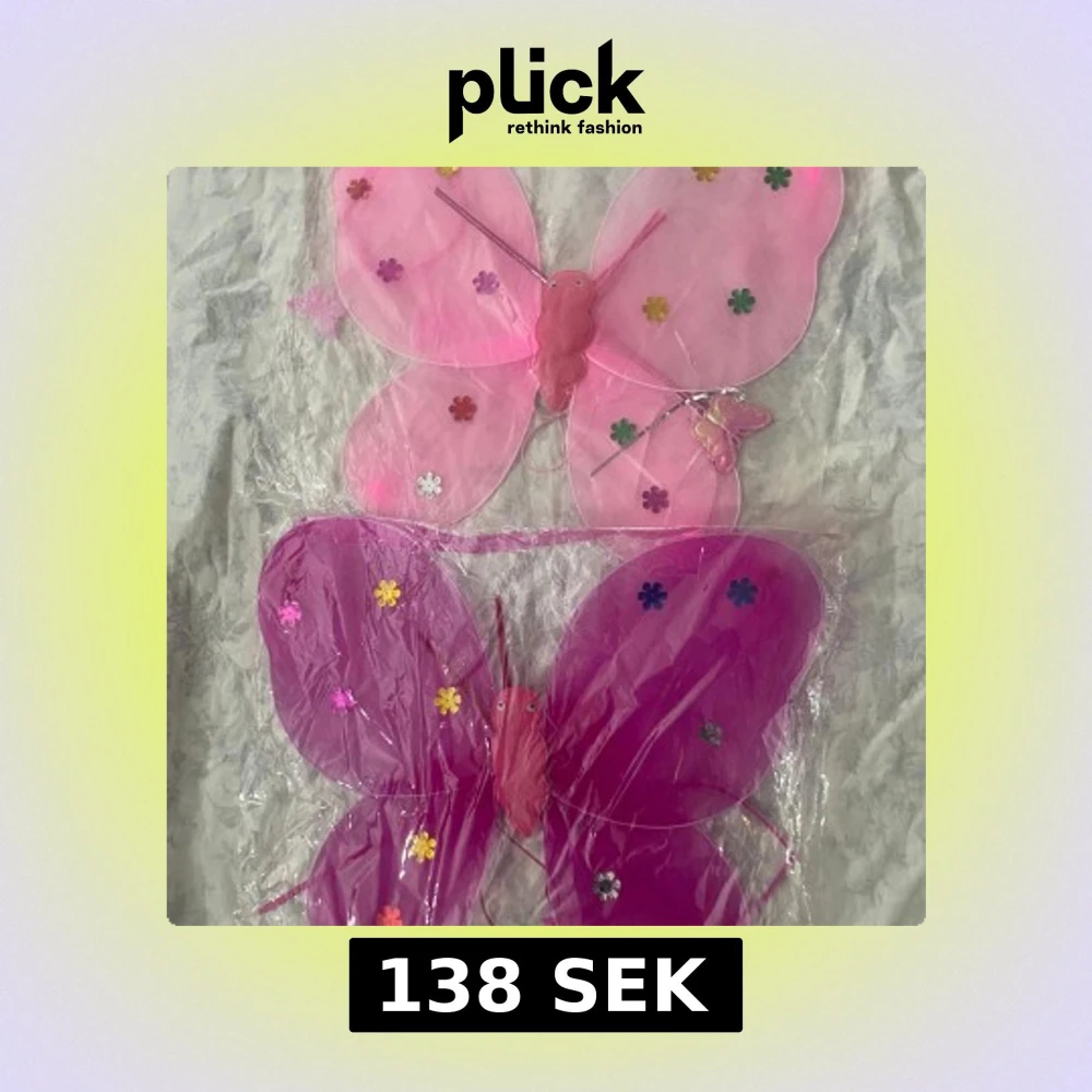 Säljer två diadem med stora fjärilsvingar i rosa och lila nyanser, dekorerade med färgglada blommor. Perfekt accessoar för maskerad eller temafest. Vingarna är lätta och har elastiska band för enkel användning. 69kr/st , 3 år +