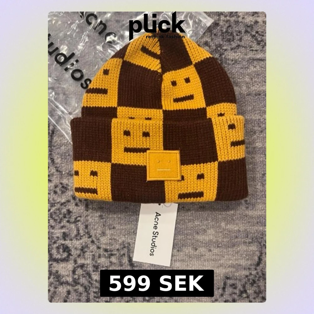 Stickad mössa från Acne Studios i brunt och gult med rutigt mönster och smiley-ansikten. Mössan har uppvikt kant och en broderad patch framtill med Acne Studios klassiska ansikte. Perfekt för dig som vill sticka ut med en cool accessoar.