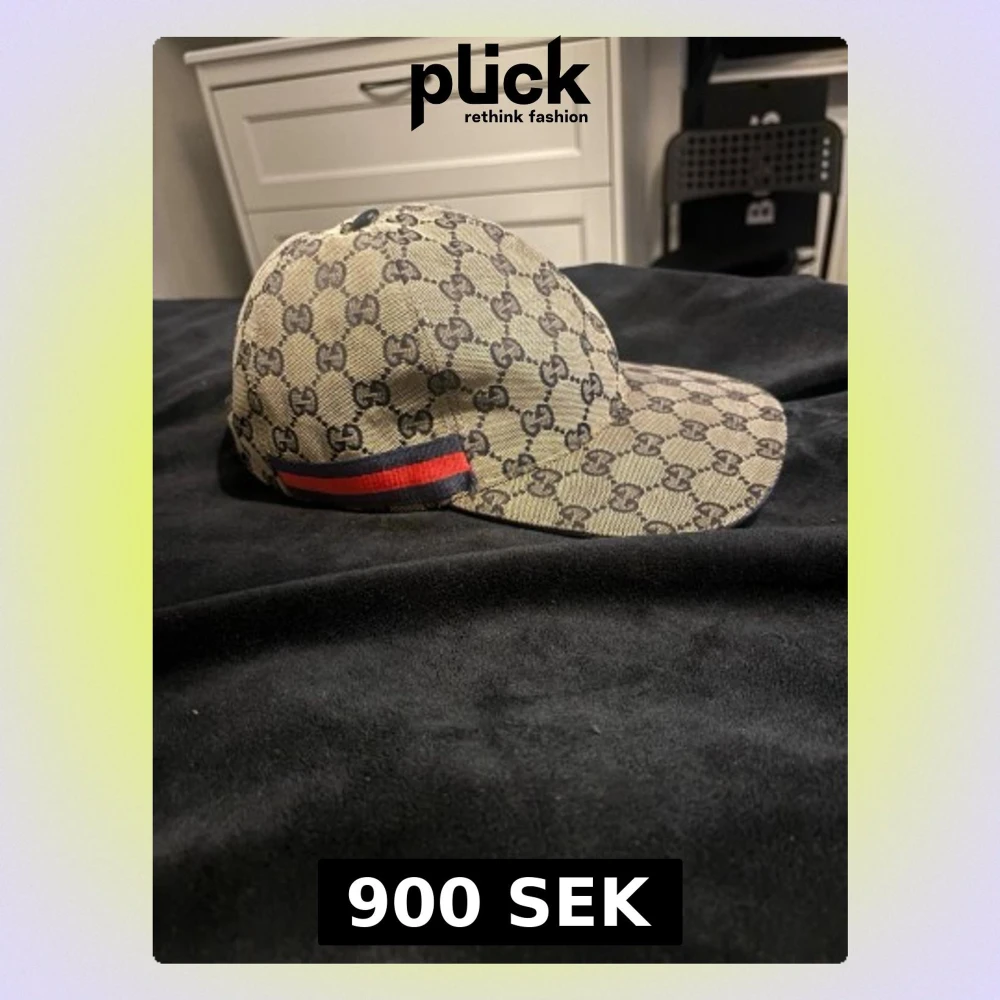 Snygg beige keps från Gucci med klassiskt GG-monogram över hela kepsen och en röd-blå rand på sidan. Kepsen har böjd skärm och är tillverkad i canvasmaterial som ger en exklusiv känsla. Perfekt för dig som vill ha en stilren accessoar med lyxig touch.