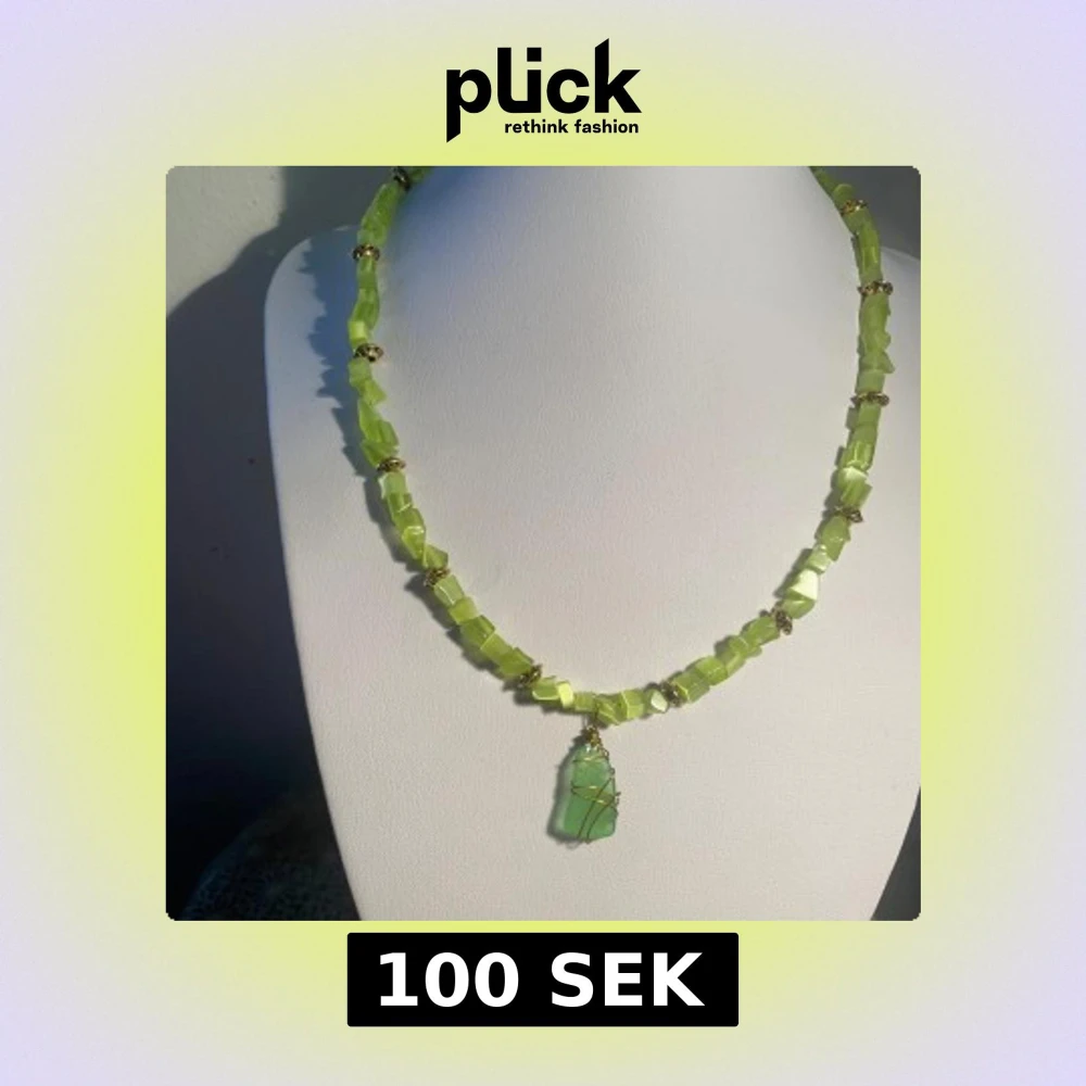 Handgjort unikt halsband med ljusgröna, fyrkantiga stenar och guldfärgade detaljer. Hänget består av en grön havslipat glas insvept i guldfärgad wire. Perfekt för dig som vill sticka ut med ett färgglatt smycke.